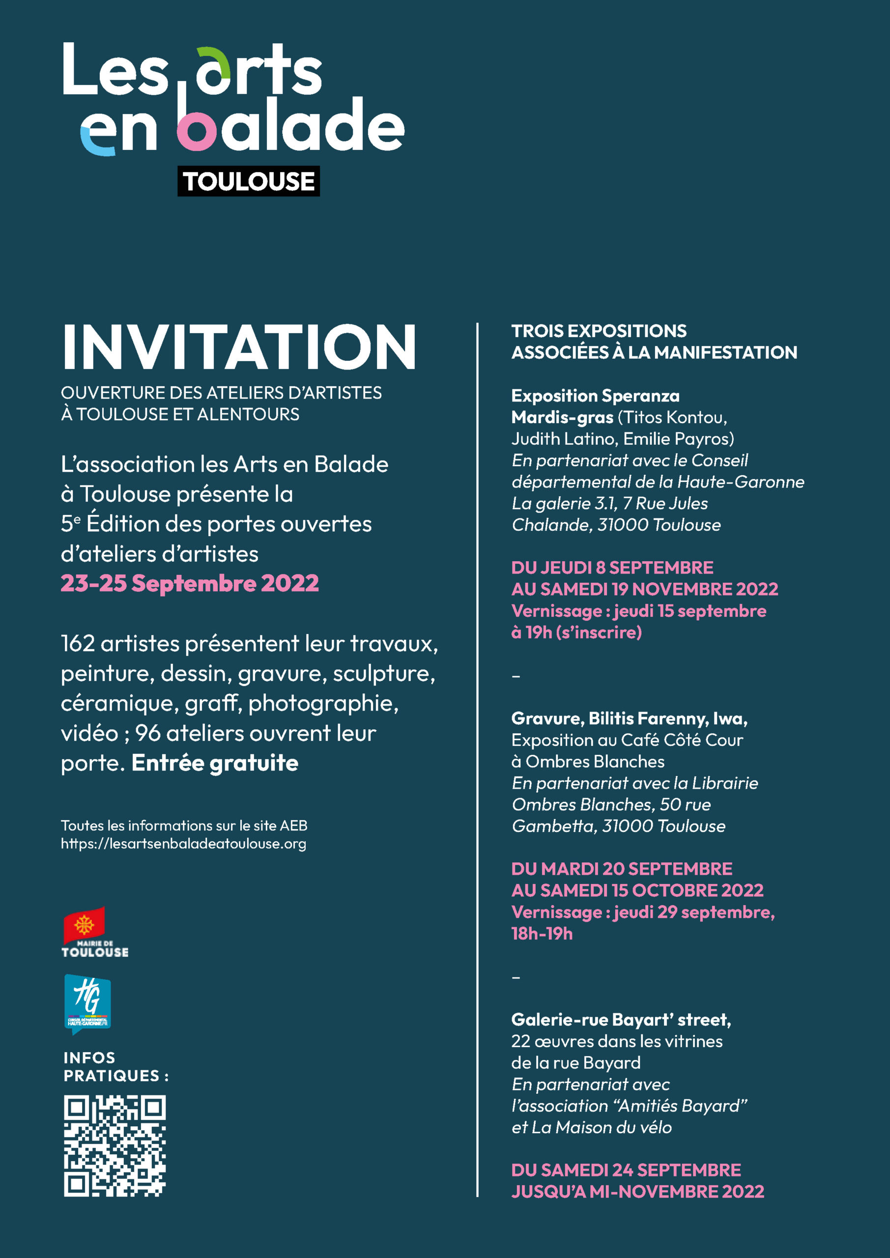 Ouverture des ateliers d’artistes à l’occasion de la 5ème édition des Arts en Balade à Toulouse 🗓 Rejoignez-nous les 23, 24 et 25 septembre 2022 162 artistes dont 13 ateliers collectifs répartis dans 96 lieux de la ville rose et de ses environs