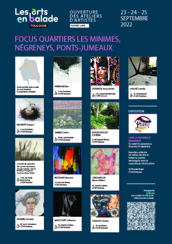 quartier des Minimes Négreneys cher à Claude NOUGARO ainsi qu’une dizaine d’ateliers essentiellement individuels. Ce circuit englobe, aux Ponts Jumeaux, le Comité de quartier, lieu partenaire qui reçoit 5 artistes (atelier 72 ).