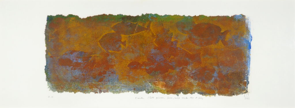Mes dernières oeuvres sont devenues au fil du temps le plus souvent des monotypes (reproduire une image plusieurs fois m'intéresse beaucoup moins aujourd'hui…), qui tendent également de plus en plus vers le pictural, voire même l'abstraction… Ce que je veux représenter est encore présent, mais devient moins visible, voire parfois complètement brouillé par la couleur elle aussi devenue prégnante.