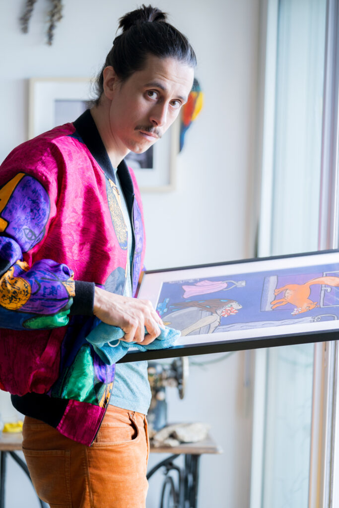 Je me concentre sur l’harmonie des couleurs, des contrastes et des textures. Au début ce ne sont que des tâches, puis les sujets prennent vie grâce au cerne noir que je trace systématiquement autour de mes aplats de pastel. À ce moment-là, je me sens un peu comme le Pr Frankenstein, je regarde mes créatures prendre vie… C’est la plus grande des récompenses !