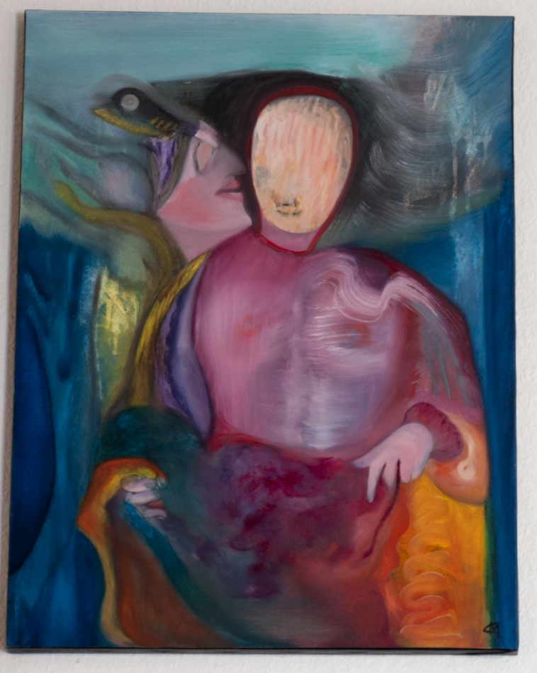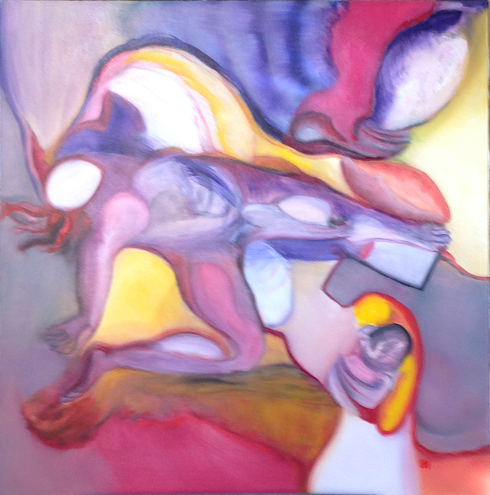 En principe je commence ma toile à partir d’un objet,d’un drapé ou d’une silhouette quelconque dont les formes multipliées abolissent le blanc ou le vide pour aboutir au chaos. Terrible moment ! mais le plaisir de peindre se manifeste rapidement avec des regards, des mains ou divers animaux qui surgissent pour donner forme à l’informe et matérialiser mes obsessions.