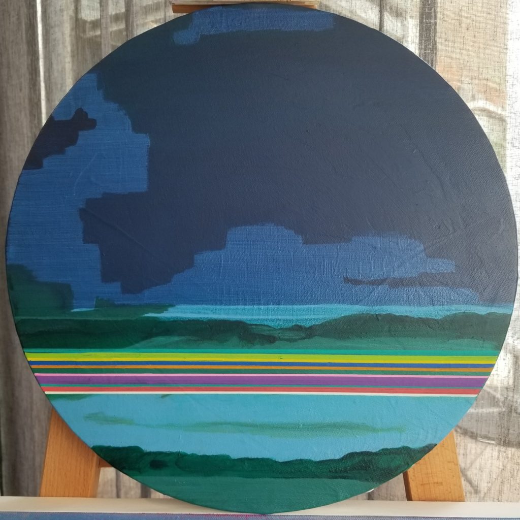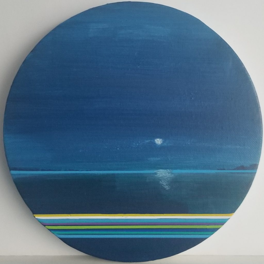 La peinture m’amène à la lisière entre ciel et eau, je peins des “paysages” non figuratifs, les couleurs d’un horizon où la lumière joue en surface avec la transparence et la profondeur des bleus . Une permanence de sujet sans cesse remise en question cependant par le traitement de la matière, la curiosité et la confiance dans le jeu de peindre.