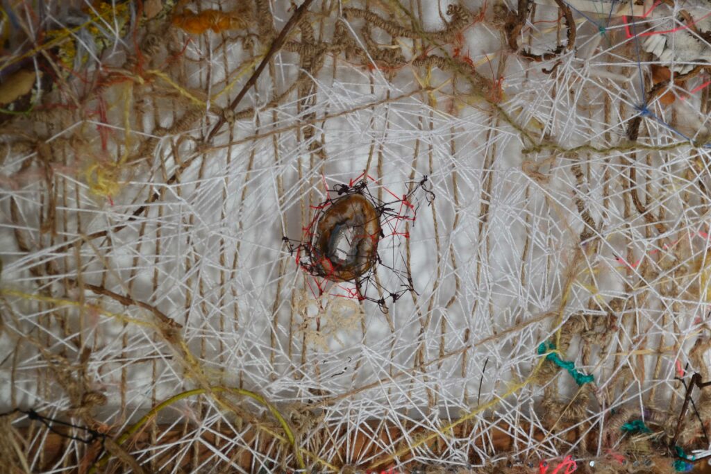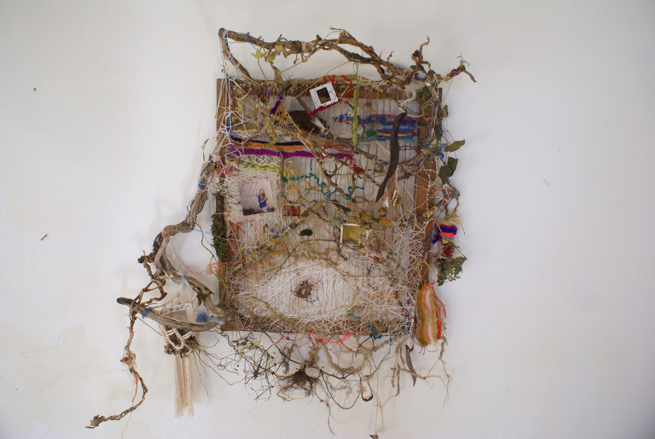 Dans mon travail, je mélange à la fois des éléments organiques, des brindilles, de la céramique, des plantes, des roches, de la cire, des nids d’oiseaux, des morceaux d’écorces, des os ; mais également des tirages photographiques de différentes époques.