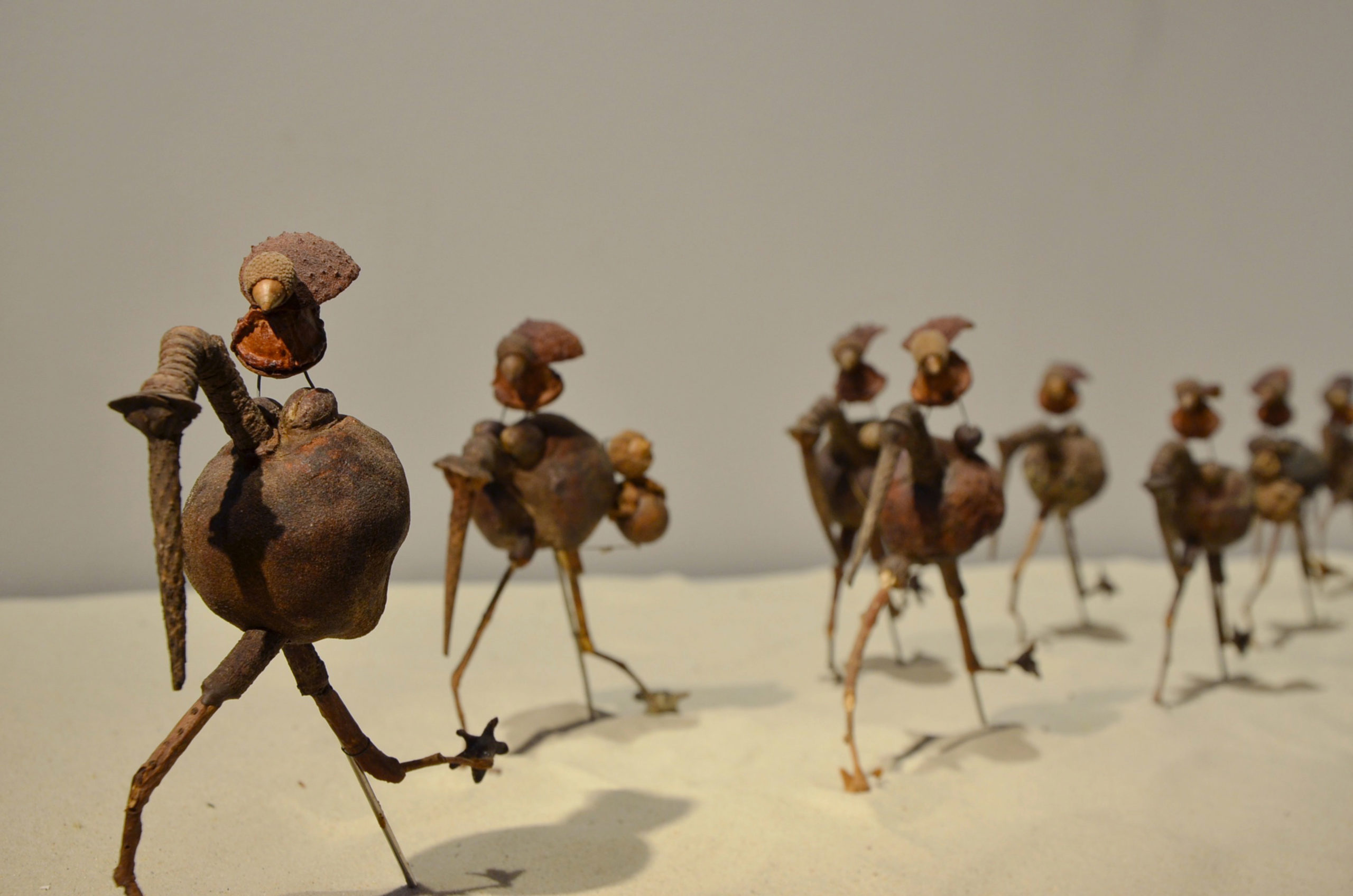 L’oeuvre Migrations commencée en 2018, comporte plusieurs séquences / installations organisées chacune dans l’espace sur un mode linéaire: trajectoire, cheminement, défilé.
