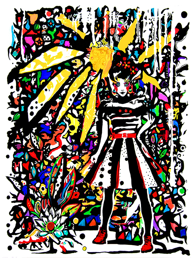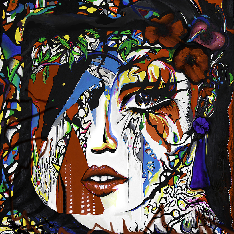 Dans un univers graphique composé de toiles et papiers, les outils d’art numérique, des jeux de matières, encres, feutres, craies, crayons, stylos, huile, peintures sur photos, peuvent s’inviter en fonction de ce que je souhaite exprimer.