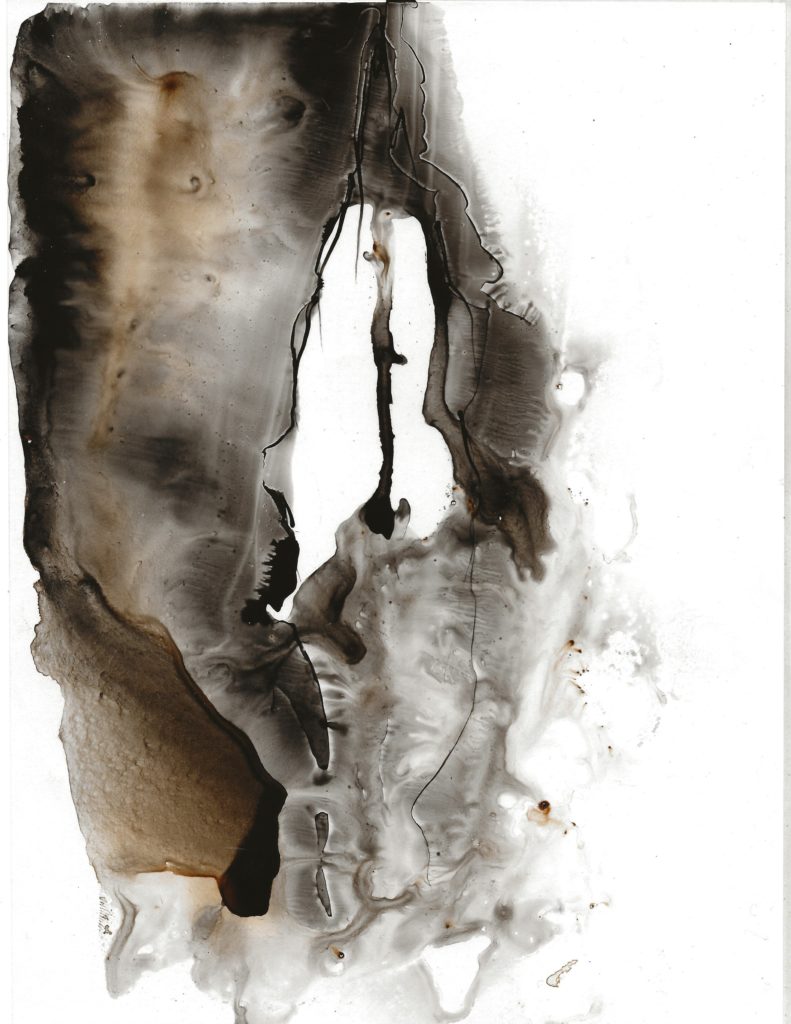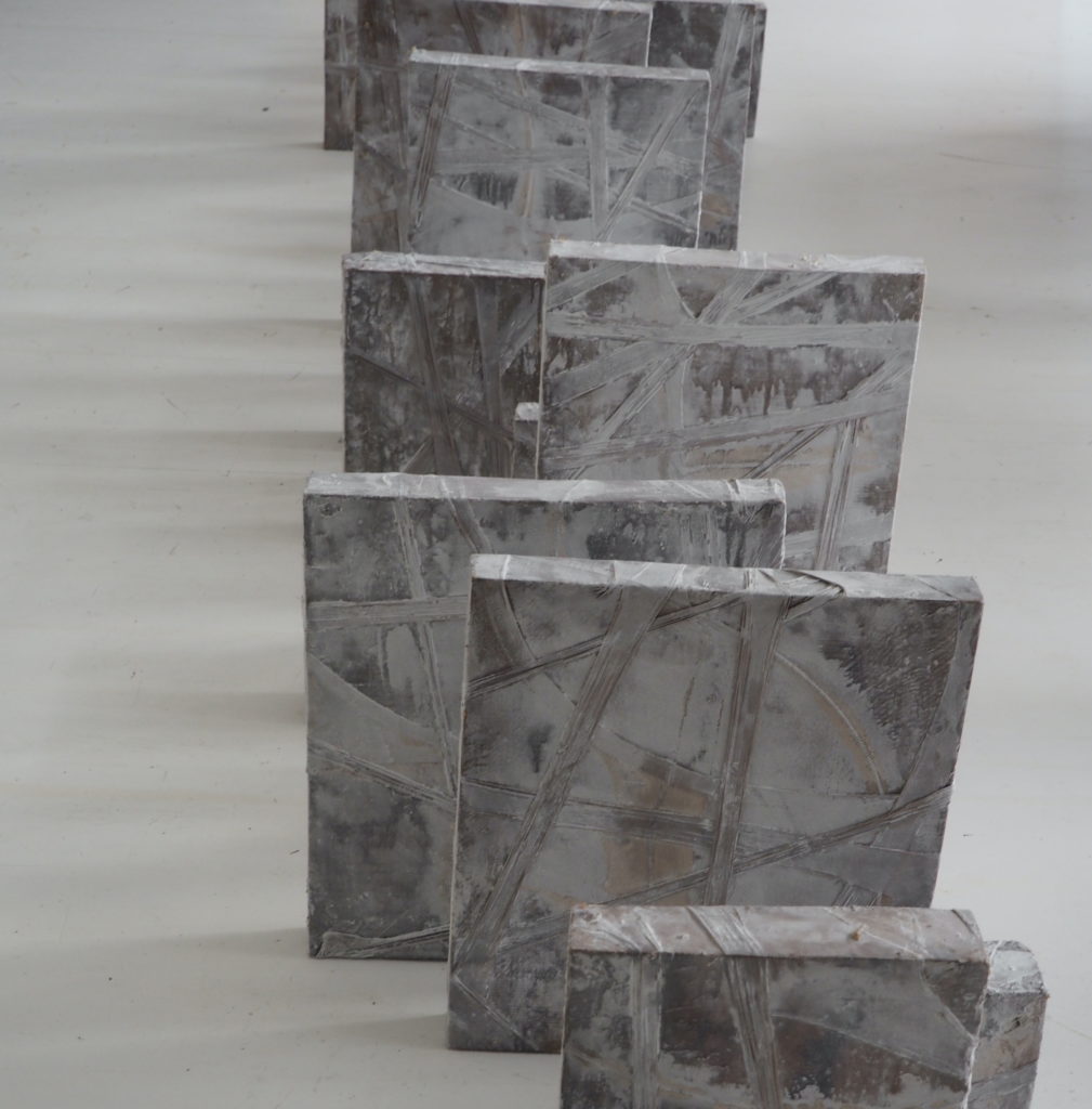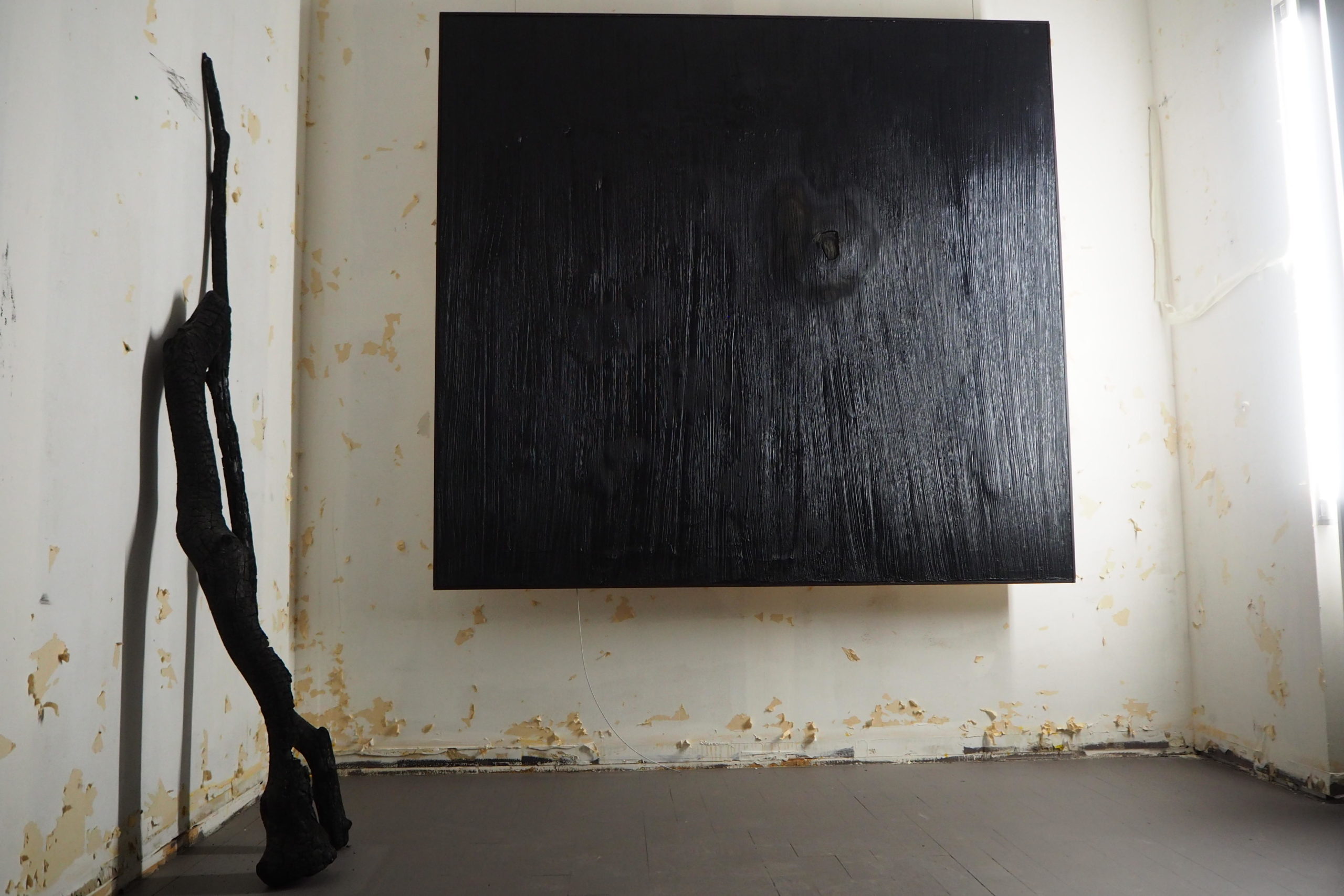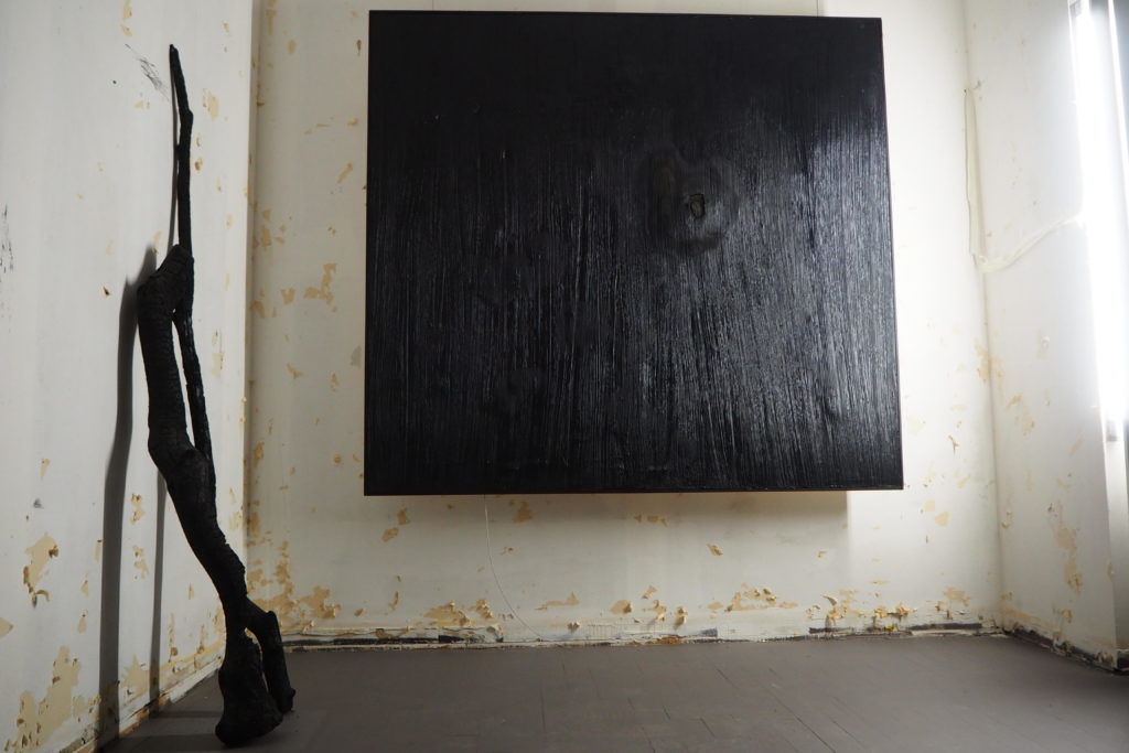 Il compose avec des matières vivantes : latex, goudron, encre de chine, brou de noix, cire, bois, végétaux…