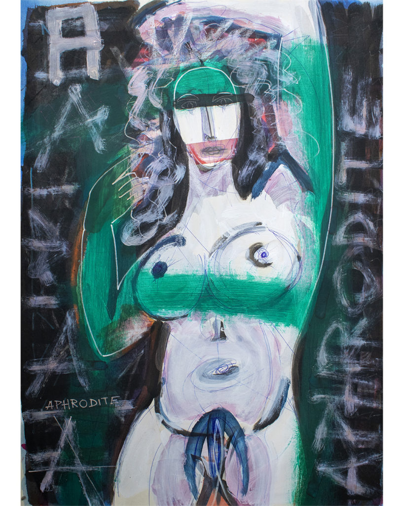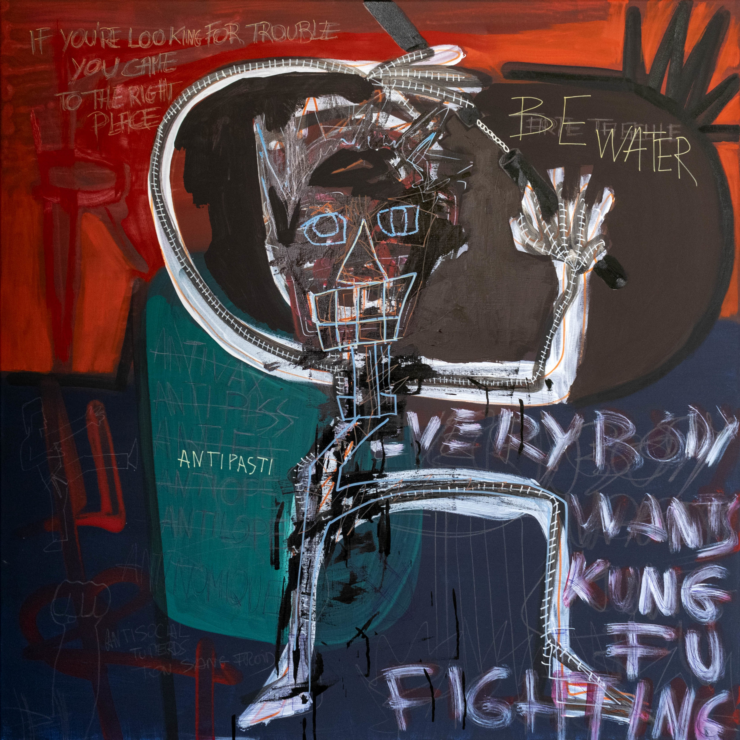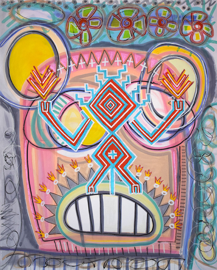 Sa peinture toujours très colorée relève un dessin naïf, frais qui n’est pas sans rappeler la nouvelle figuration. Son style est puissant avec une direction narrative où se mêle le quotidien intime de l’artiste et la culture “universelle” des médias, avec toujours cette pointe d’humour qui lui semble essentielle.
