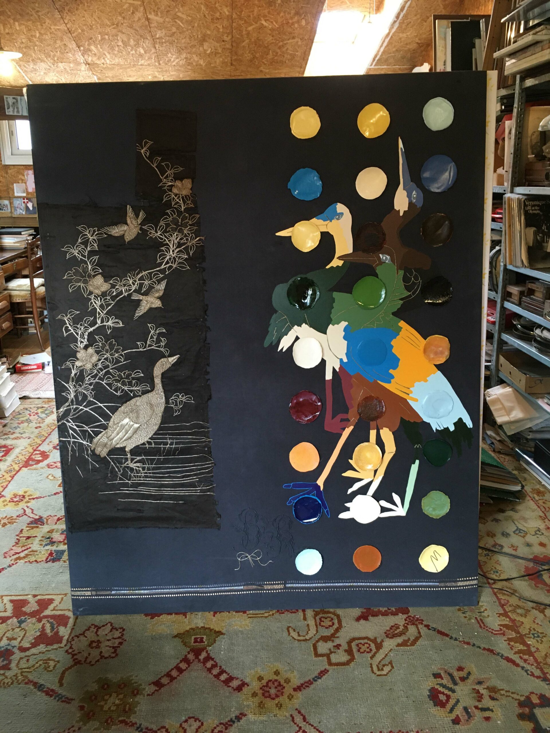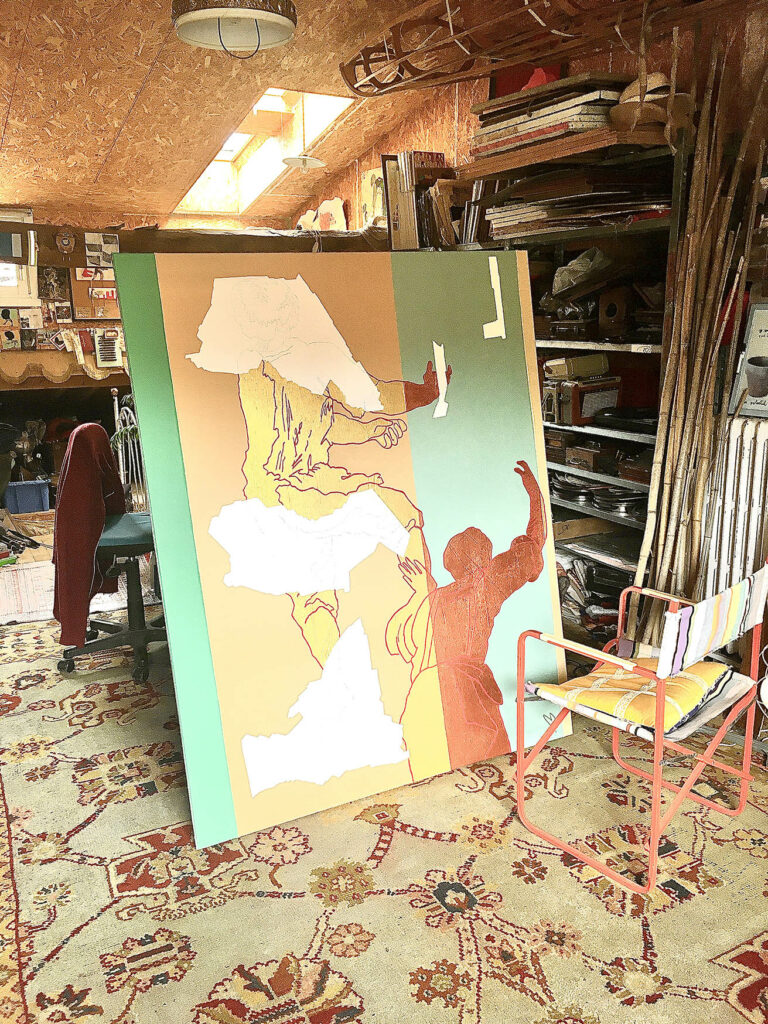Faire, parce que d’y penser, ça me stresse. Je peins de façon intuitive et réfléchie. Un alliage entre une capture d’images, rapide, et une maitrise du résultat lent. Le matériau de départ est un stock d’images de magasines (personnages, objets, couleurs). Ma démarche est basée sur un travail d’emprunt, une méthode de hold-up. A l’inverse des malfrats, qui dans un premier temps, lentement, nettoient toutes les pièces de leurs armes, tranquillement en silence et qui, dans un deuxième temps, rapide, opèrent. Et pourquoi une casserole ou une montagne? Ça m’est égal, c’est intuitif. C’est plutôt qu’est ce que je vais faire avec ça, c’est la réflexion.