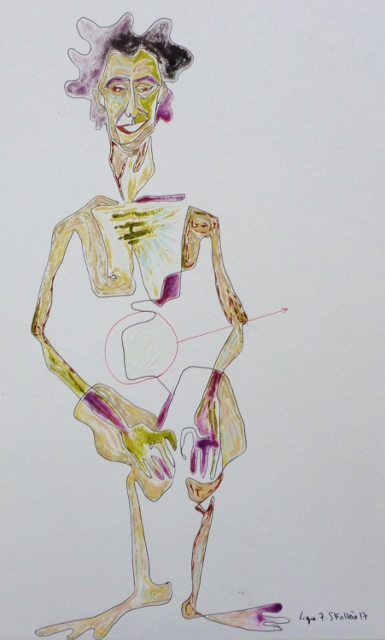 La ligne figurative travaillée au stylo ou à l’encre de Chine noire, au pinceau, dans la terre, requestionne l’espace habité, les géographies intimes du corps et de ses limites.