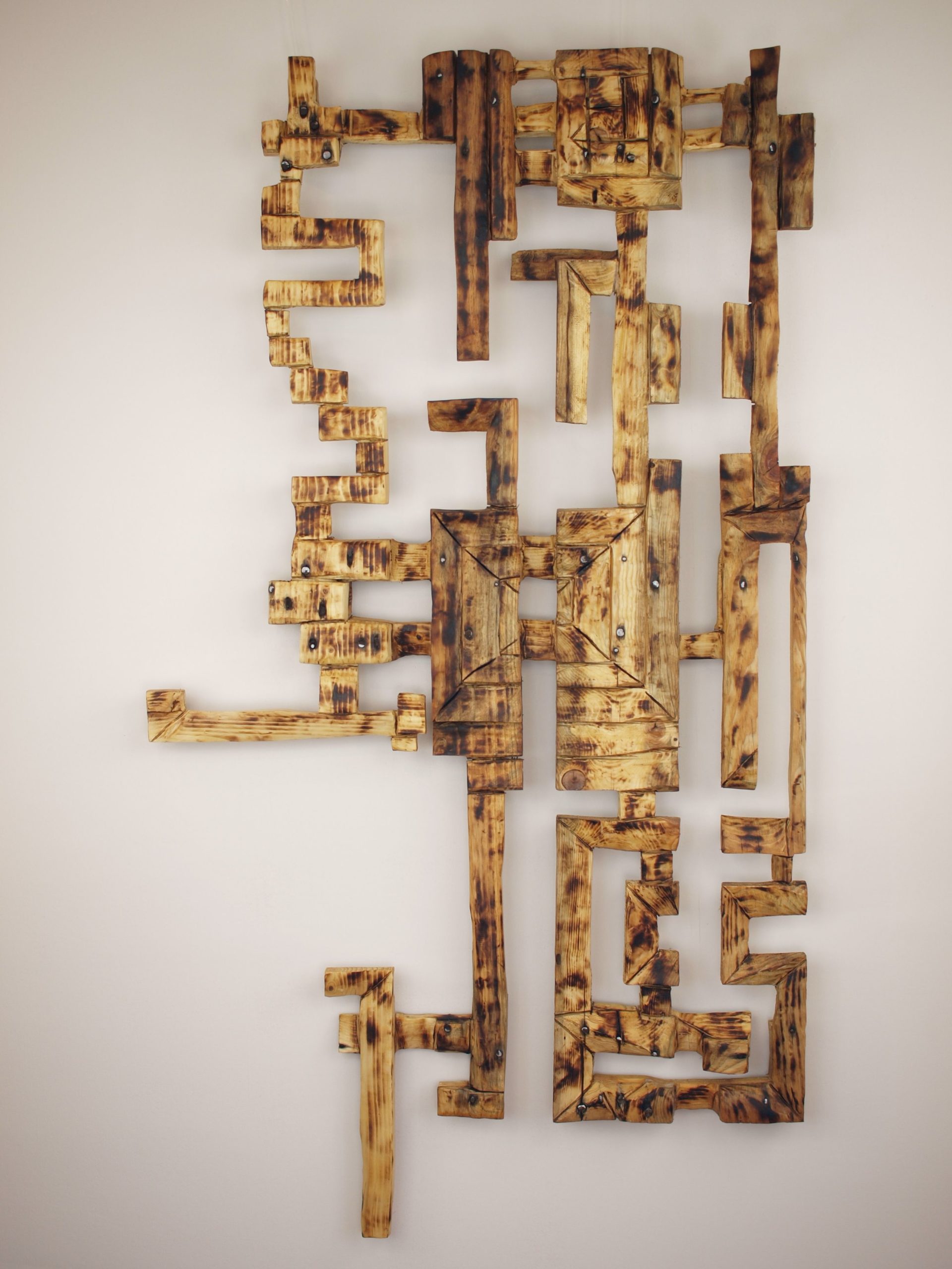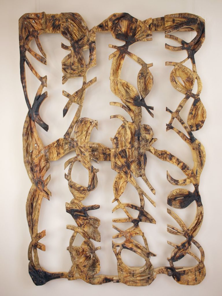 Avant qu’Erick ne les transforme par son travail d’artiste, les palettes ne sont pas encore des sculptures mais elle sont déjà puissamment architecturées : plusieurs planches forment un plateau cloué à plus ou moins six pieds, eux-mêmes cloués à au minimum deux planches. Chaque palette a ainsi une forme initiale, reconnaissable et quasi immuable.