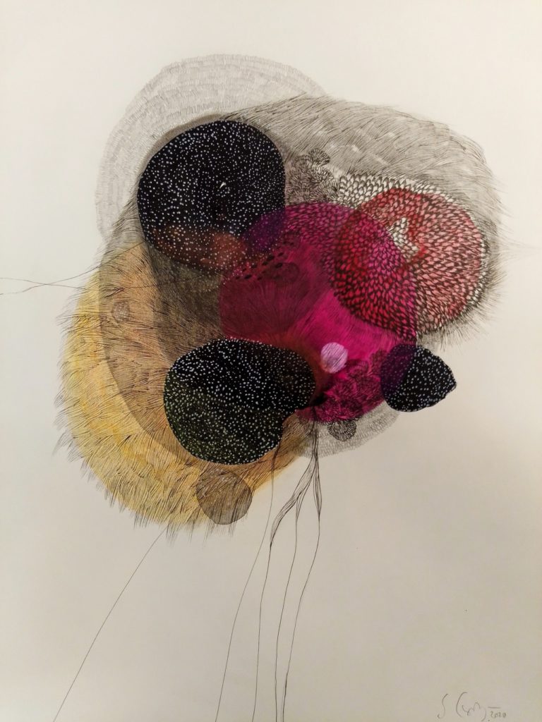 Peintre, dessinatrice et «poseuse d’images», je mêle et entremêle ces différents modes d’expressions, créant un univers intimiste. Mon approche créatrice est bercée par des thèmes récurrents, comme la mémoire, le monde de l’enfance, l’intimité de la femme, le discours amoureux. Depuis plusieurs années je développe un travail autour de l’encre, du crayon. Le dessin est pour moi un acte d’abandon, une respiration autour de formes librement inspirées de la dentelle. Mes dessins sont comme des petites pelotes de laine, que l‘on déroule doucement dévoilant une part intime de nous.