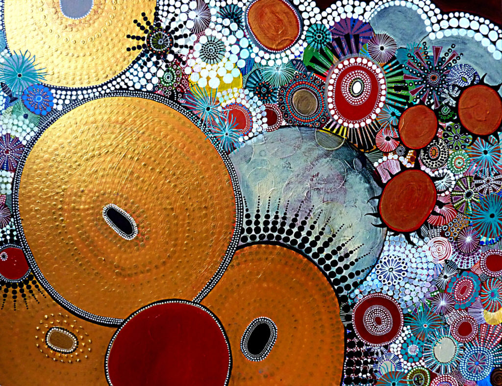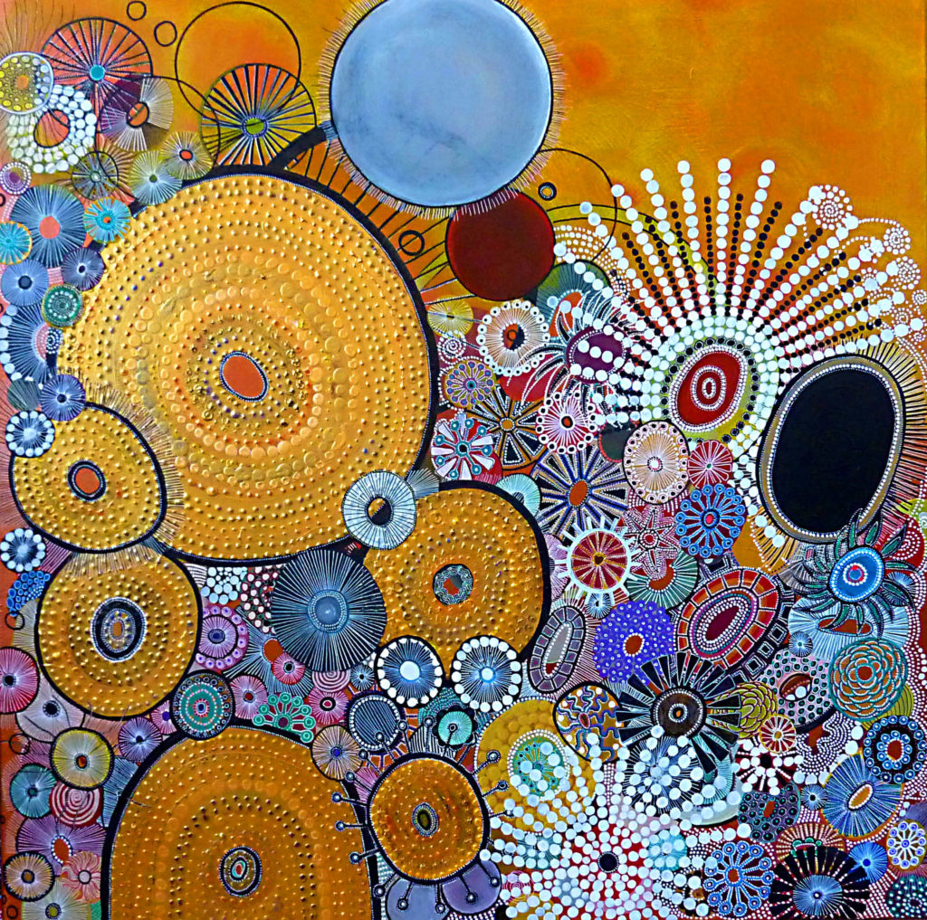 Ma démarche artistique est un travail sur le fond et sur la forme, la recherche d’harmonies et d’équilibres sur une base purement intuitive et instinctive. Je me laisse guider par mon inconscient, par les formes et les figures qui se profilent au-delà de toute volonté. Ces figures apparaissent à la fois incarnées et flottantes, centrales et silencieuses, emplissant l’ici et voguant dans l’ailleurs, multiples et scindées. Plus que de représentation, il s’agit de présence, de transcendance, c’est l’idée de la chose plus que la chose elle-même qui m’importe. Je rationalise peu, le moins possible, et laisse mon intériorité émotive me guider. J’aspire à me laisser traverser par ce qui flotte autour de moi, à capter des signes ou des messages qui bien-sûr sont nourris d’une foule de données relatives à mes voyages, mon passé, mes rêves, diverses nourritures à la fois culturelles, spirituelles et intellectuelles. C’est volontairement que je ne les formalise pas. Je les laisse créer, au delà de tout intellect, de toute théorie, des visions et des scènes, qui plus tard, une fois achevées pourront me surprendre ou, en aval, mériter une réflexion, voire un discours, une conceptualisation. Le récit s’esquisse, s’impose et m’impose de poser tel trait, telle couleur, telle phrase pour laisser une empreinte qui en sera la synthèse. Je travaille principalement l’acrylique (avec medium) sur toile de lin. J’y ajoute ici et là collages, huile, craies pastel et feutres. La matière, la richesse et la profondeur du rendu occupent autant de place que le travail des couleurs, des formes et du propos. Mes influences sont multiples. A la base, il y a l’Art aborigène que j’ai découvert lors de longs séjours en Australie. Un art à la fois innocent, abstrait et ésotérique, terriblement esthétique et secret, porteur d’un savoir ancestral. Une expression à la fois symbolique, venue des profondeurs des temps et parfois naïve. Les symbolistes (Odilon Redon, Gustave Klimt) et les néoexpressionnistes (Jean-Michel Basquiat…) font également partie de mes inspirations puisqu’ils laissent une grande part au monde onirique, dans ce qu’il peut avoir de plus doux mais aussi de plus étrange et libéré du réel. Tel l’Art iconique religieux qui ne représente pas le monde qui nous entoure mais le transfigure en s’affranchissant de notre vision terrestre en trois dimensions. Enfin, j’ai toujours été fascinée par les peintures ou dessins d’enfants qui portent en eux la création artistique telle que j’essaye de la vivre : spontanément, sans conceptualisation ni pensées limitantes.