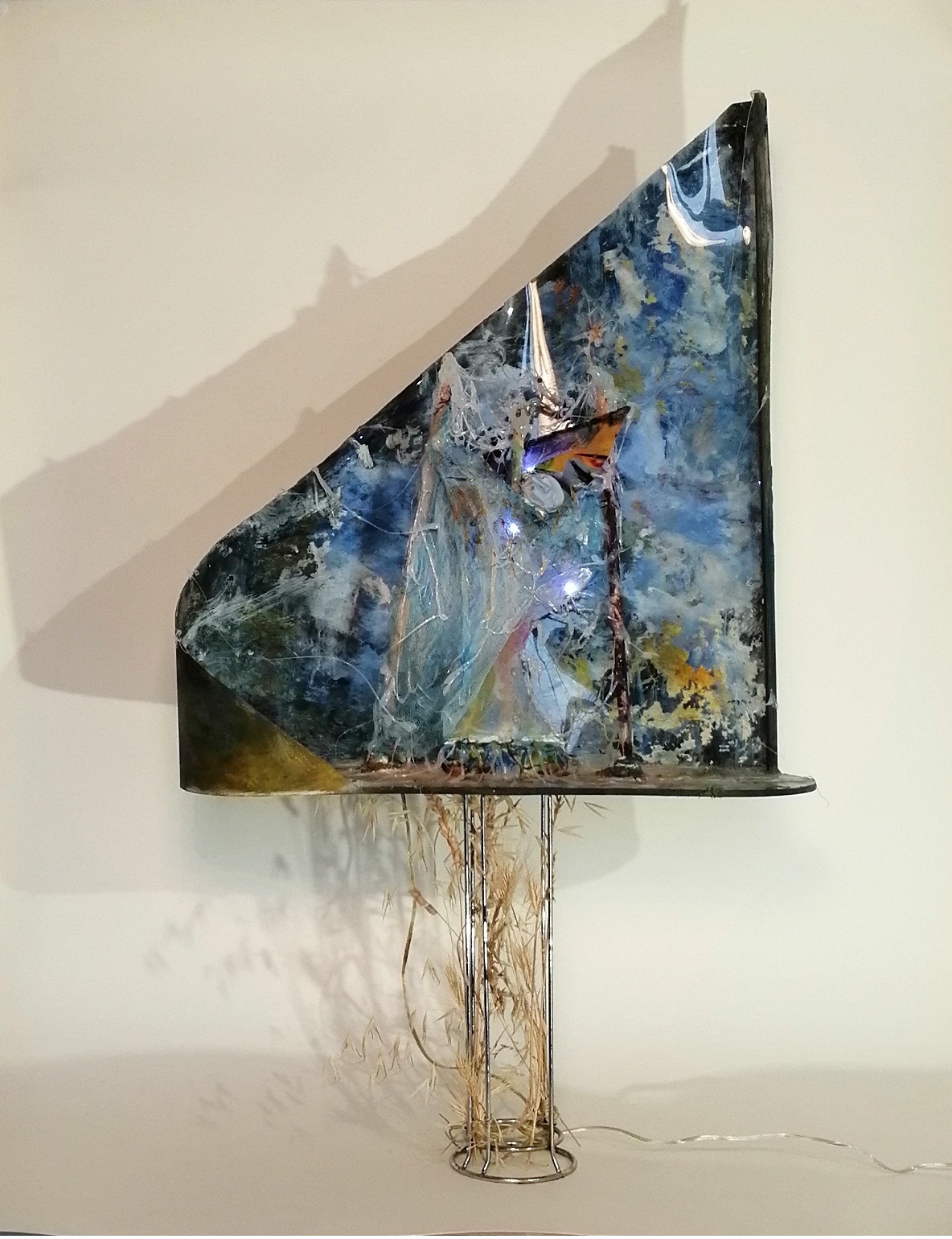 Le Voyage est réalisé à partir de plexiglas chauffé, peint, de colle chaude, bois, épis de blé, pierre sculptée : un univers onirique .