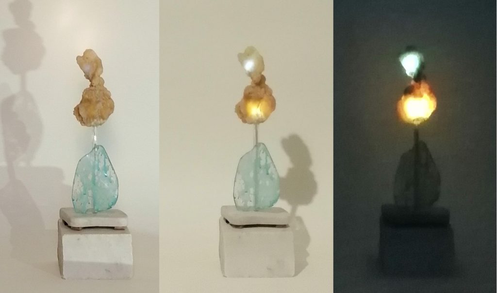Mon travail de volume procède de la création de mondes, grâce à de multiples matériaux récupérés, modifiés, telle la pierre dans laquelle je voyage et lui donne la lumière ; elle devient sujet de rêverie, tout en racontant sa propre histoire.