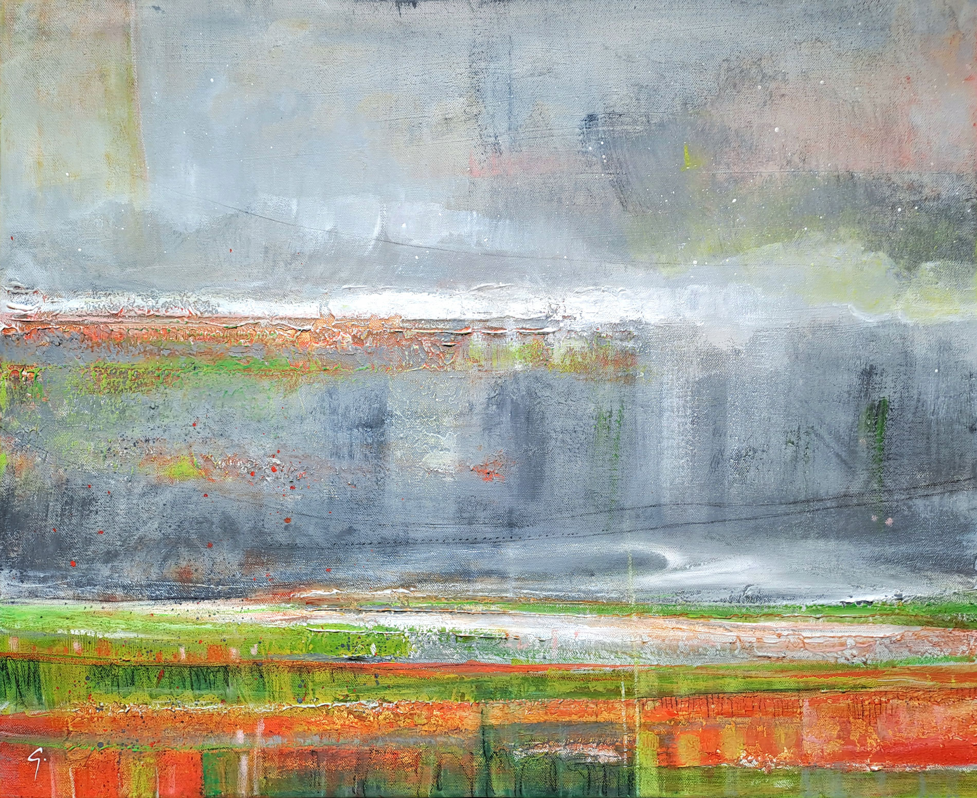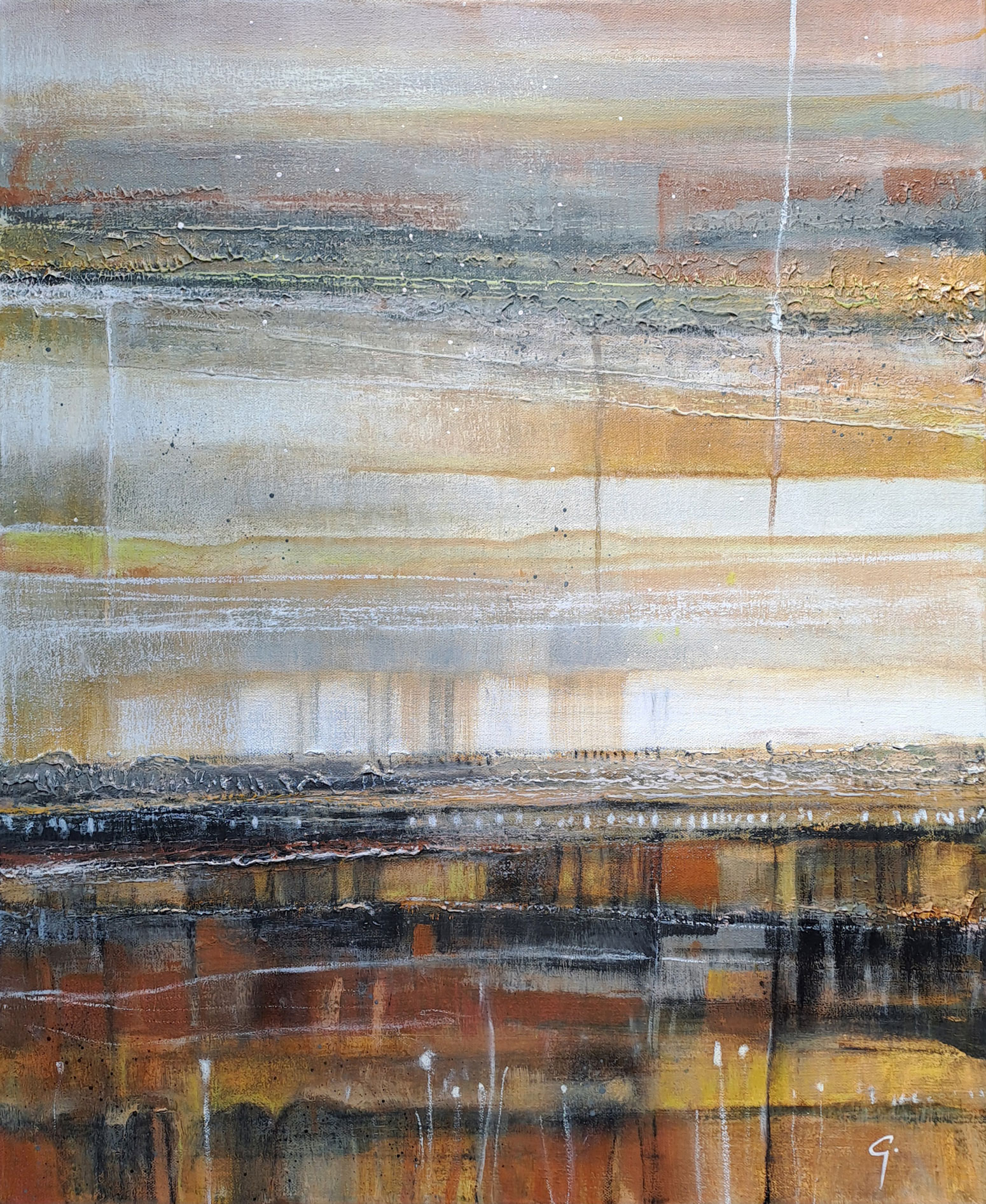 Introduits par la matière, enduits par mes mains, noyés dans mes jus d’encre et marqués par la couleur.. puis définis par mes craies, parfois nimbés de doré ou subtilement tracés de noir; c’est ainsi que naissent mes “HORIZONS”, révélés par la lumière, comme des fenêtres de contemplation, de réflexion ou de repère sur notre propre vie d’humain face à la nature.