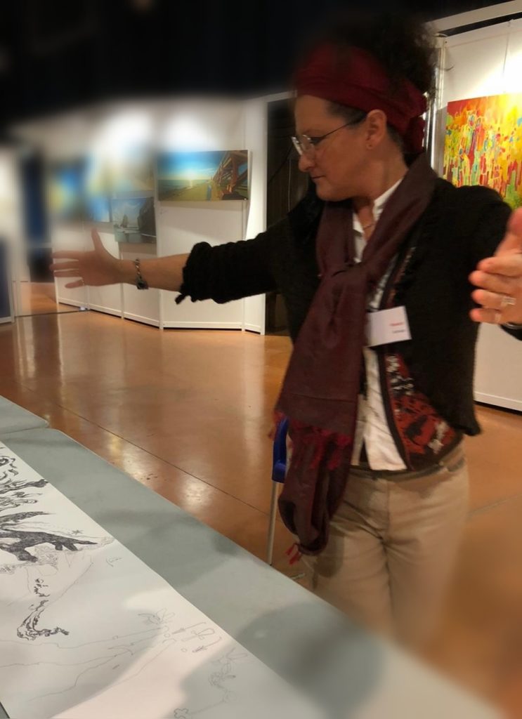 Mes œuvres s’organisent autour d’une recherche graphique qui s’est développée depuis quelques années sur une recherche en alchimie. La symbolique alliée au travail du trait organise désormais et architecture mes expositions dont un rouleau de plus de trente mètres au total est la colonne vertébrale. Il décline les expressions des règnes, ainsi que les quatre éléments. Basé sur un travail d’introspection, une quête philosophique exigeante, basée sur les lectures de Bachelard, Bergson et les philosophes antiques, mes toiles font partie de cette geste qui se construit au fur et à mesure de l’élaboration des tableaux peints uniquement en noir, blanc et rouge, les trois couleurs des trois œuvres alchimiques. Une recherche persévérante et joyeuse de la quintessence.