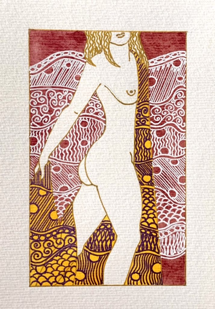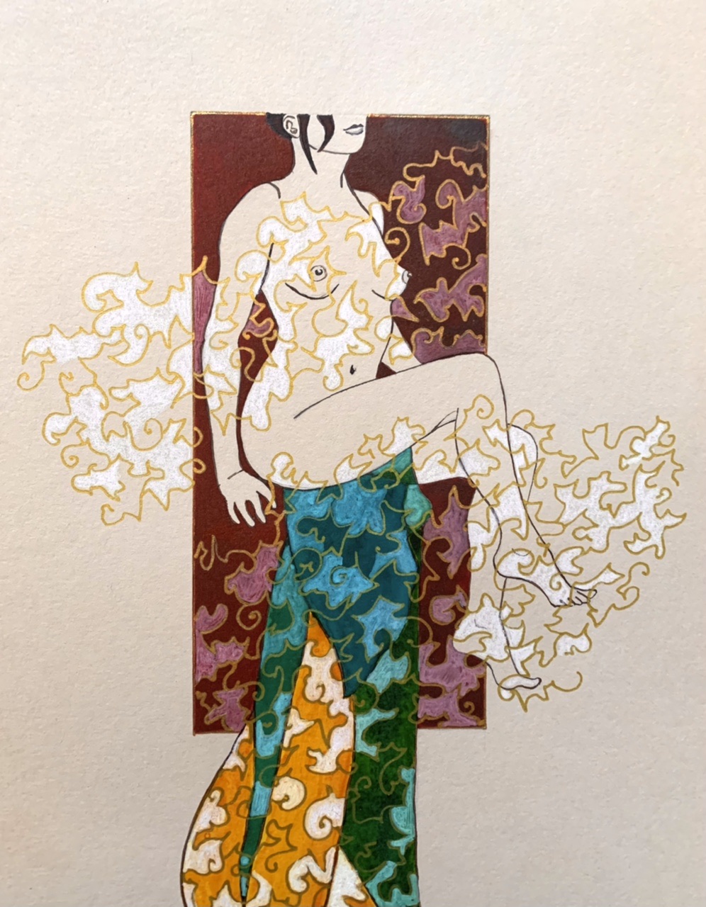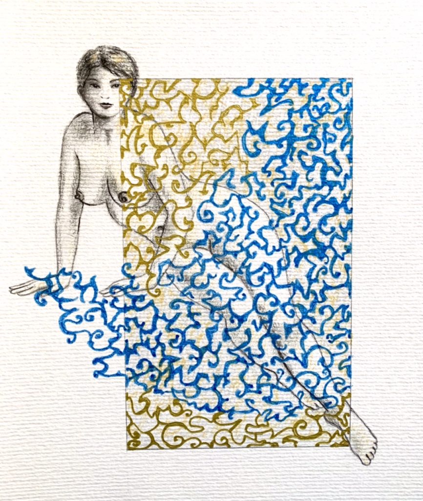 Ma pratique artistique prend des formes diverses entre sculptures, dans lesquelles j’assemble différents matériaux de récupération, et travail de peinture. Mes dernières créations m’ont amené à réaliser une série de dessins sur la représentation du corps. Ils questionnent les choix de cadrage et l’occupation de l’espace. Les drapés aux tissus imprimés de motifs, par leurs mouvements, s’inscrivent dans ce jeu sur l’espace où parfois fond et forme s’entremêlent.