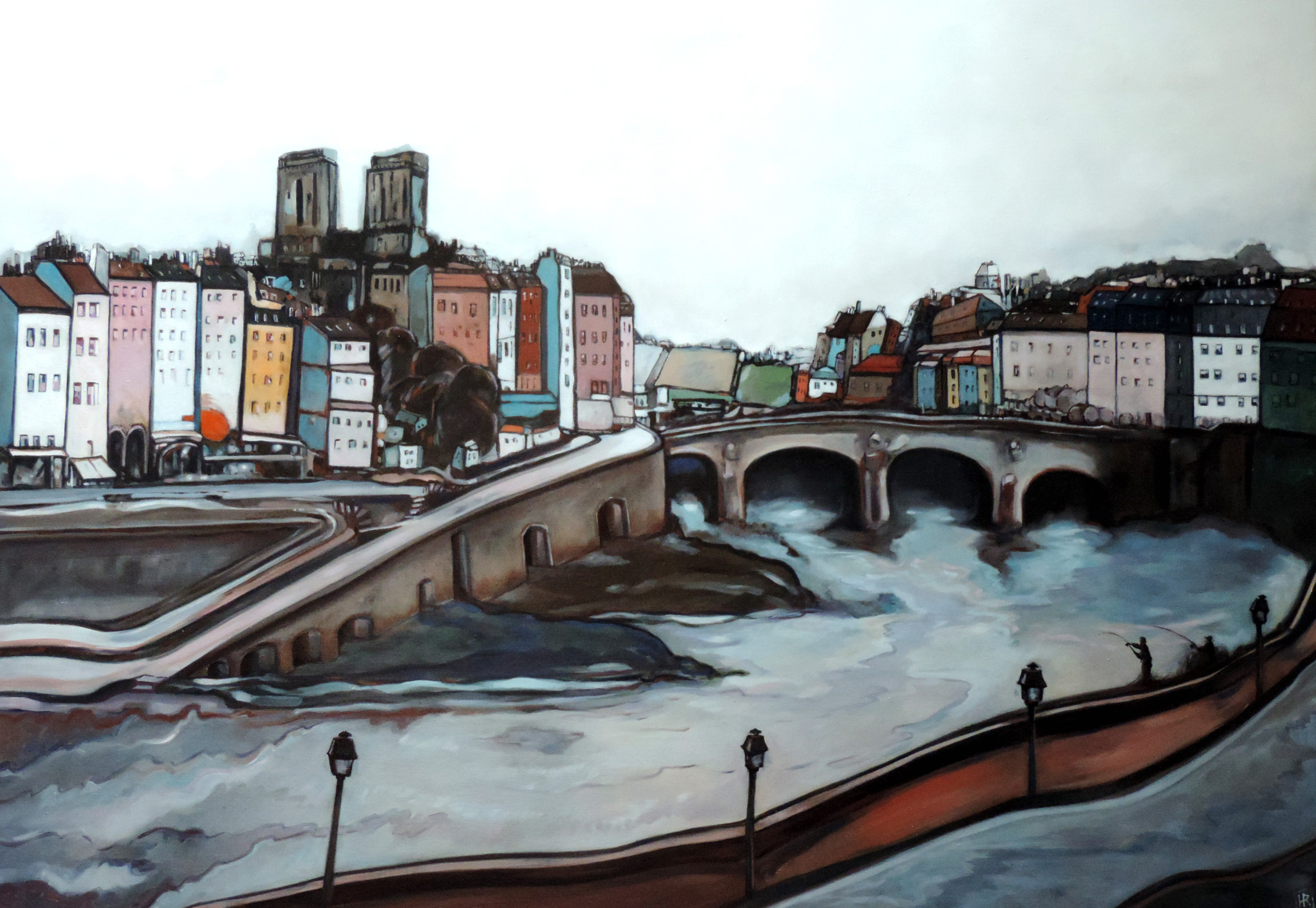Mes tableaux récents sont d’une part, des paysages urbains, ce qui m’intéresse ici c’est la musicalité, le rythme crée par les lignes horizontales, verticales et obliques, jouer entre le réalisme et le déni du réalisme, l’équilibre et le déséquilibre et également de représenter dans un espace la présence humaine sans qu’il y ait besoin de l’y inscrire.