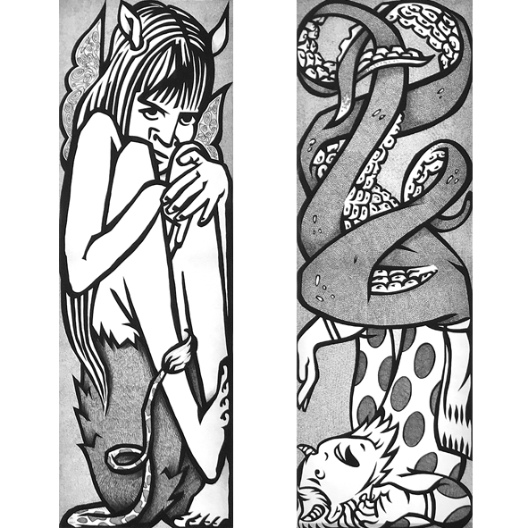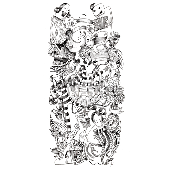 C’est en utilisant le dessin traditionnel (à la main, noir et blanc) et inspiré par mes lectures, littératures jeunesse, comics et BD que je pratique l’accumulation, l’enchevêtrement, l’association des lignes dessinées pour créer un nouvel « univers global qui se tient » mêlant faune, flore, objets, pour créer des personnages grotesques et improbables.