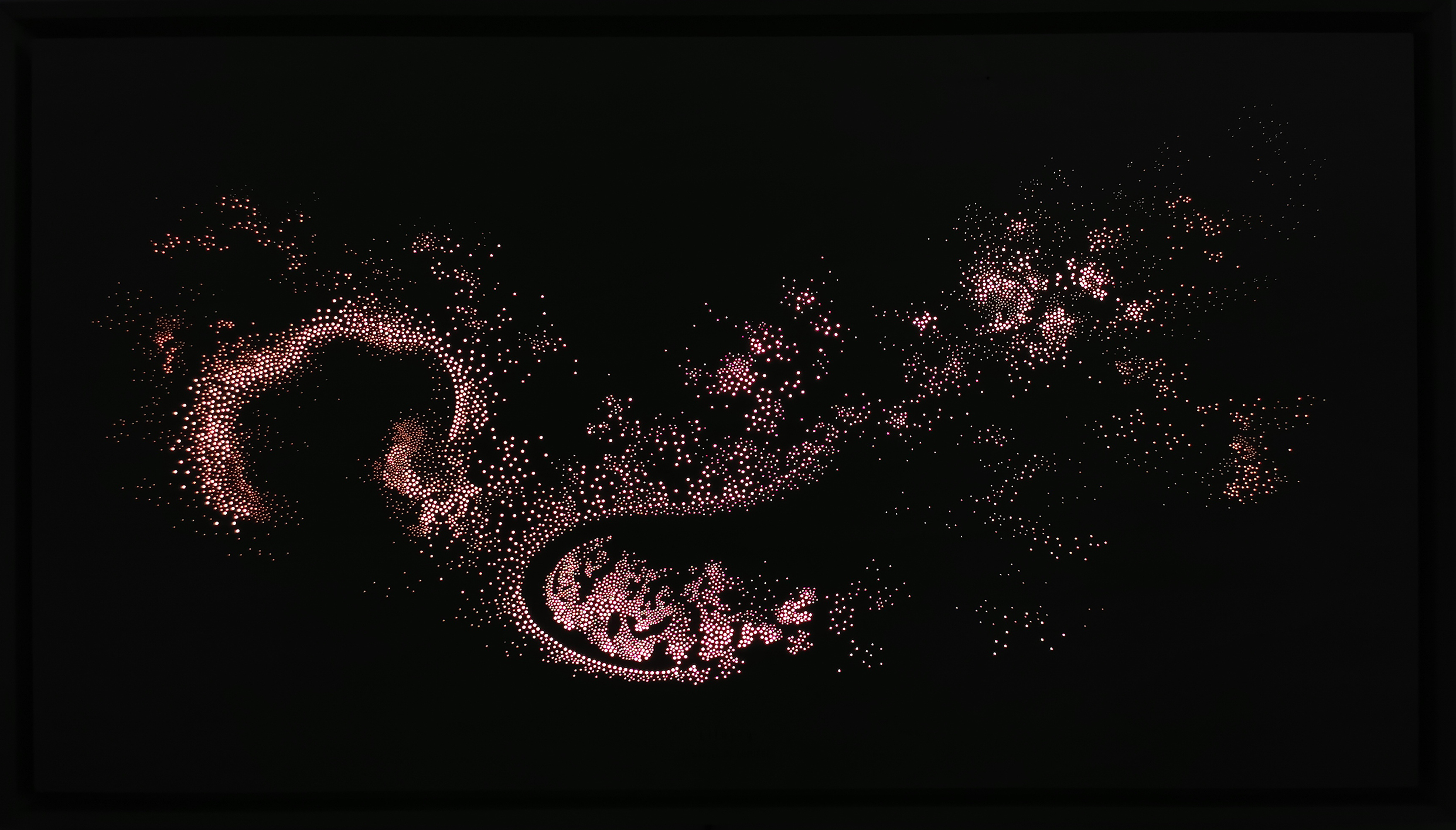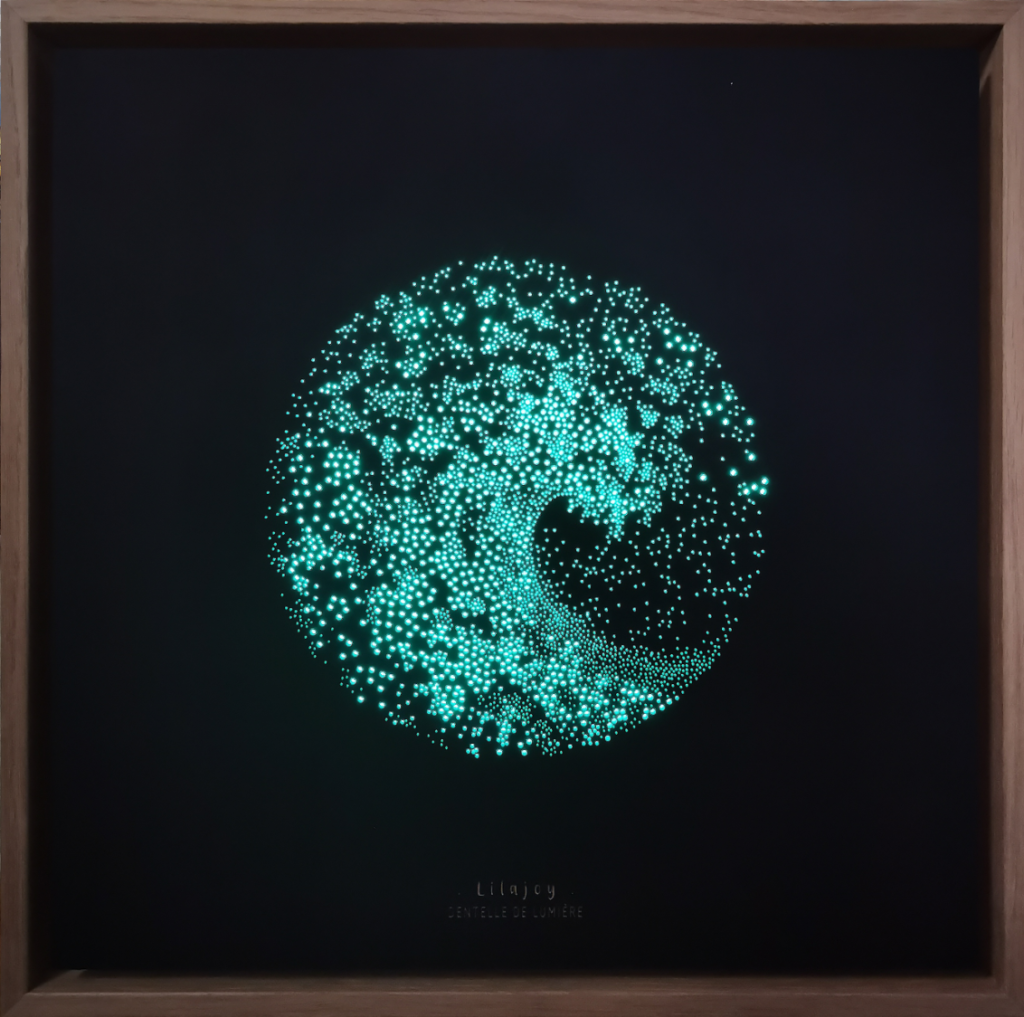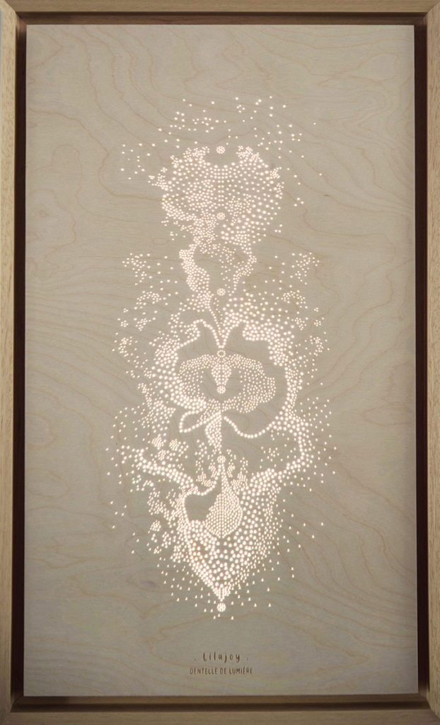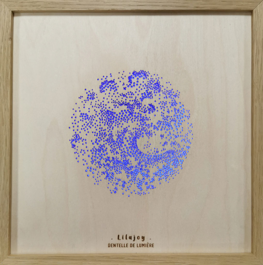 D’un geste délicat, Anaëlle Bouthier alias Lilajoy donne forme à des dentelles, à travers lesquelles une lumière diffuse se faufile avec pudeur. Elle perfore le bois et joue avec les densités des percées pour créer des oeuvres lumino-cinétiques qui ont pour caractéristiques de se mouvoir dans l’œil du spectateur au cours de son déplacement. Il y a quelque chose d’apaisant dans ses tableaux lumineux, un équilibre où plein et vide ne font qu’un et nous transportent, nous rapprochent de nous-mêmes. Murmures d’un rêve, mouvements suspendus, les œuvres de Lilajoy portent en elles une intimité précieuse et pénétrante. Avec ce principe de bois ajouré, elle a d’ailleurs enchanté l’hôpital de Purpan du CHU de Toulouse avec un lieu inédit ” l’Espace de Ressourcement ” qu’elle a conçu en 2015 dans le cadre de sa thèse en Art.
