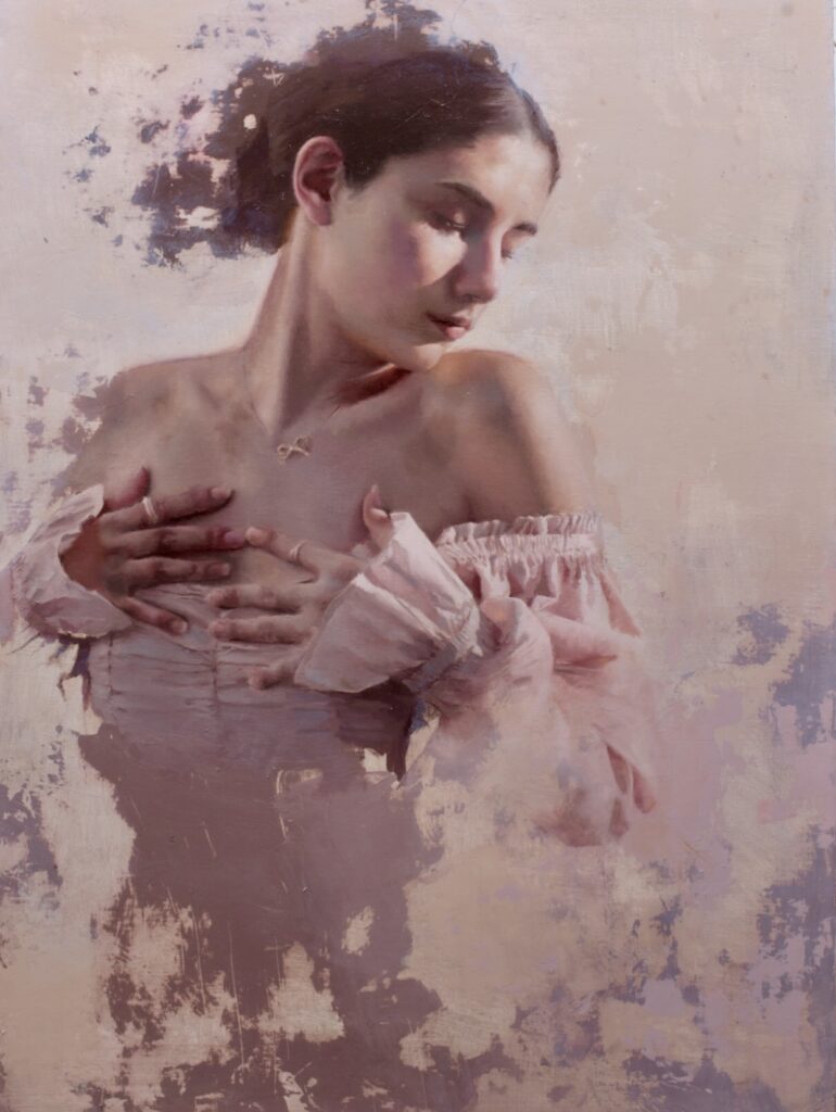 Dans son art, il a développé un style bien particulier, une narration issue de la fusion entre les styles classiques et modernes qui peut être vue comme une métaphore de la vie elle-même – une combinaison entre l’ancien et le nouveau, de la beauté et de la douleur, de l’ordre et du chaos, de la lumière et de l’obscurité. Il porte un soin tout particulier à la transition entre la figuration et l’abstraction, cherchant un équilibre entre une abstraction complète et une figuration trop présente qui ne laisse pas la place à l’abstraction, à l’imagination. Pour obtenir cet effet, il passe tout d’abord plusieurs couches d’acrylique qu’il gratte pour donner une apparence proche d’un mur arraché témoin du passage du temps. Ensuite, il travaille à l’huile pour tous les éléments de figuration : le portrait, les vêtements, les mains. Pour terminer, en général, il apporte des éléments à l’acrylique pour équilibrer la composition.