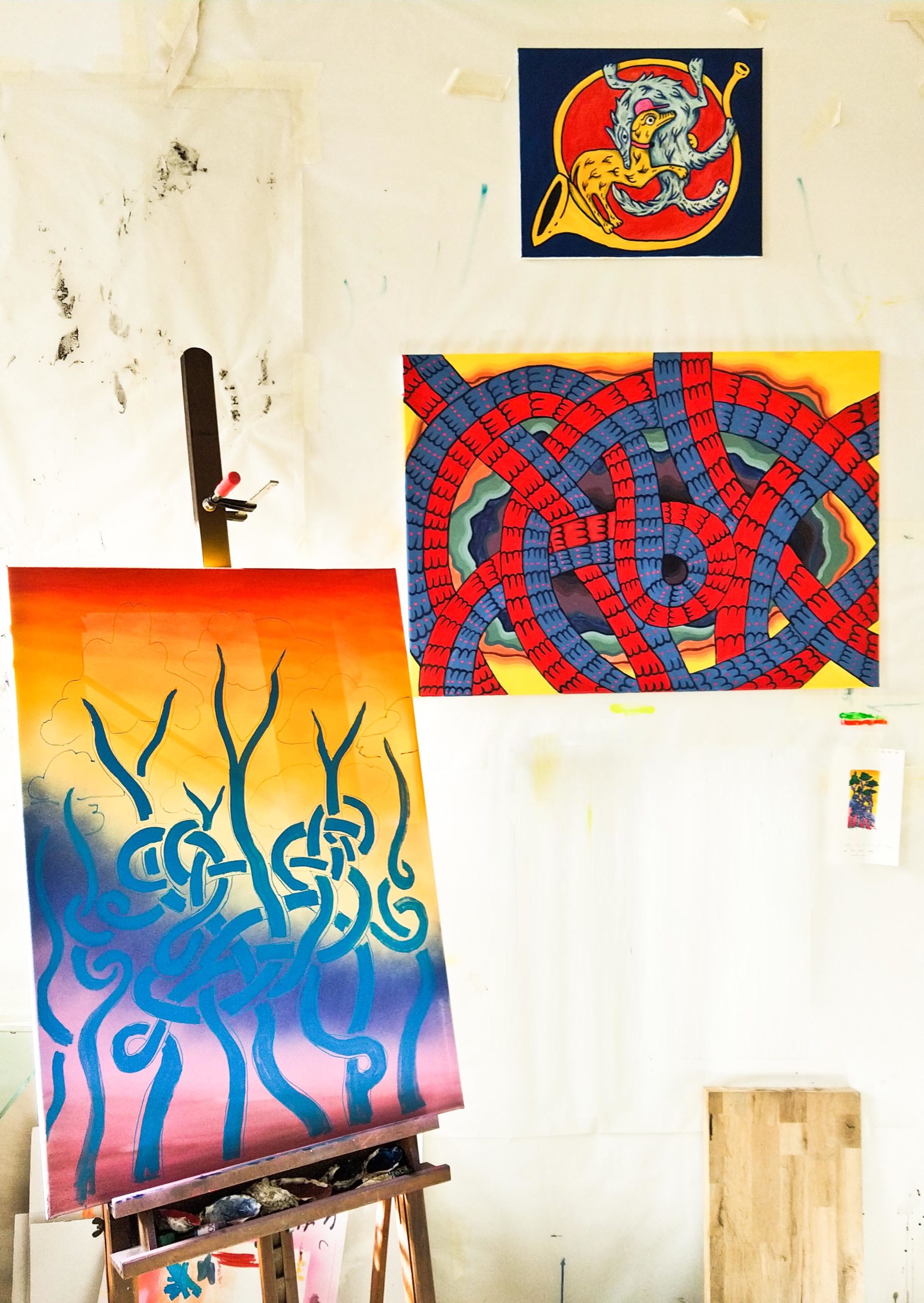 En tant que plasticien : je travaille sur une série de peintures actualisées du Béatus, œuvre qui est un véritable maillon entre l’Histoire de l’art occidental et oriental.