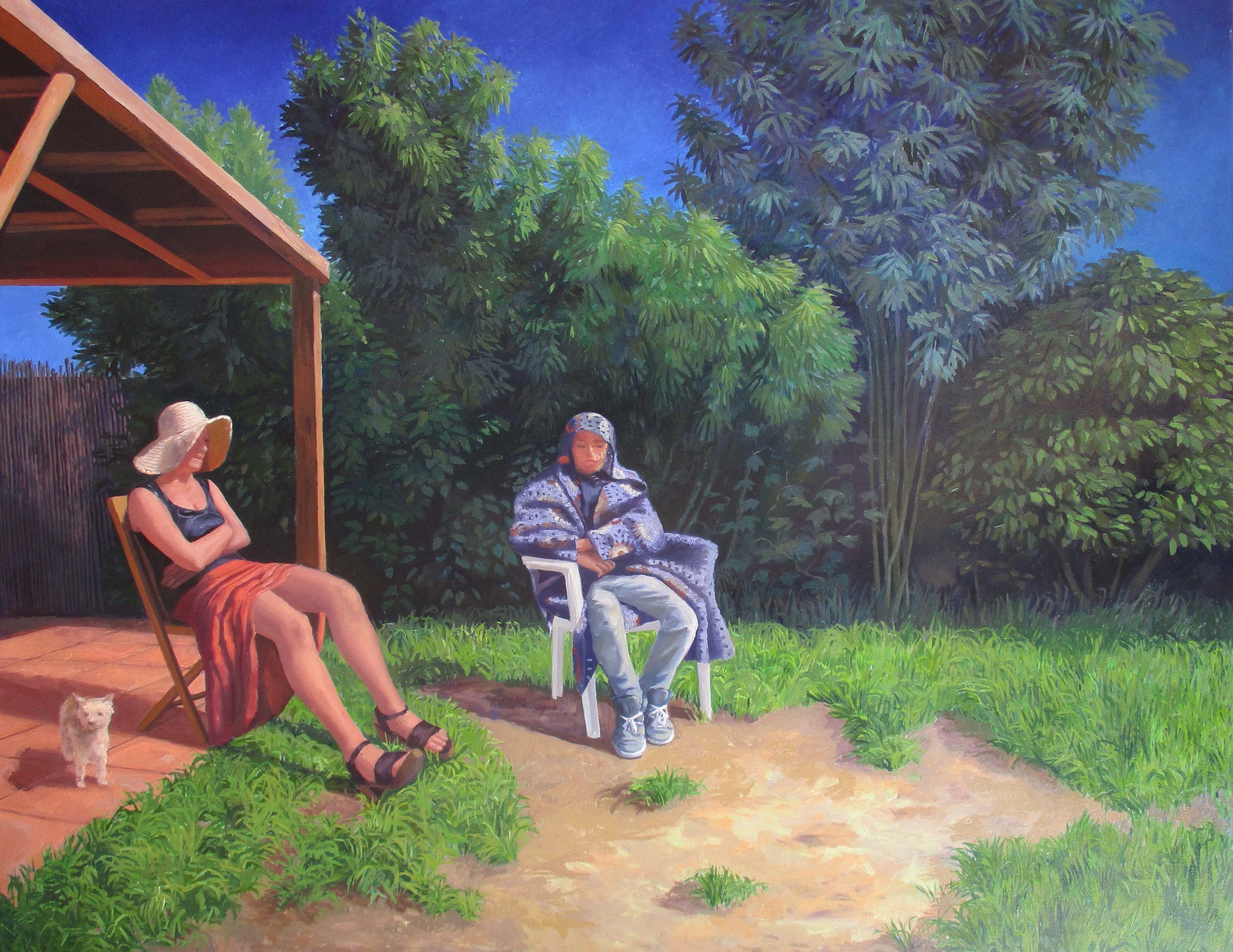 Les personnages de mes peintures évoluent dans un univers géométrique et onirique. Ils font corps avec le monde qui les entoure et s’en détachent par la pensée. Dans leur monde intime les contraires se rencontrent, le banal s’associe à l’éternité, le présent se transforme en souvenir et les choses retrouvent leur mystère.