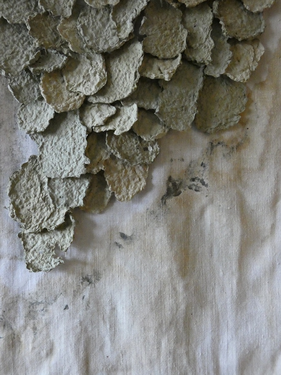 Progressivement, mes découvertes, expériences et mes convictions m’entrainent vers une pratique différente. Ma technique évolue ce qui me permet d’utiliser de façon inédite le papier pour réaliser des sculptures et des œuvres murales à la recherche des nuances et de textures. Mes matières premières sont issues du recyclage. Je les associe a des pigments, des terres que je collecte souvent moi-même, des liants naturels, du linge ancien, des objets tombés en désuétude, des éléments naturels. J’utilise des techniques et recettes anciennes que je ré invente. Mon travail évoque l’impermanence, le souvenir dans un esprit wabi sabi.