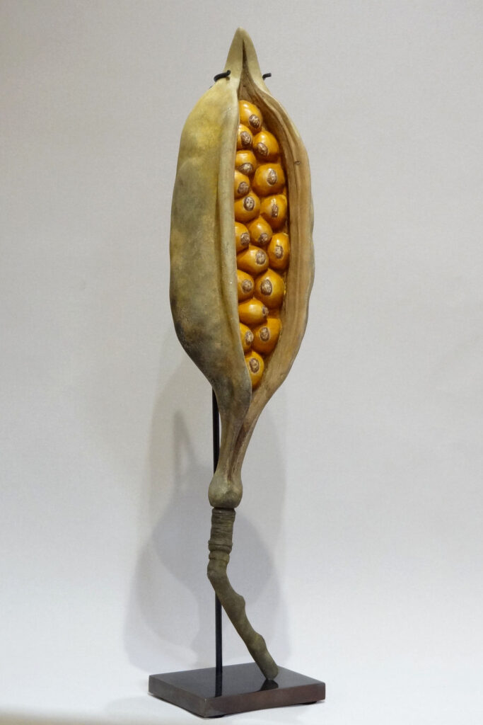 Dès mes premiers pas dans cet art, j’ai sculpté le bois et le marbre pour en extraire des rondeurs, des formes voluptueuses qui racontent les gens, la vie, les rêves… Nul besoin de détails, le trait est épuré ; sans détour ni artifice ce sont les attitudes et la matière qui parlent. Aussi mes femmes sont elles rondes, sensuelles et surtout généreuses de par la douceur et la plénitude qu’elles dégagent. Toujours dans cette même recherche, j’ai ensuite abordé le thème que j’ai dénommé « les récréatives » où je me promène dans le monde ludique de l’enfance avec un regard sûrement plus humoristique, ou parfois plus caustique. Consécutivement à cette exploration humaine, je me suis également intéressée au végétal en m’inspirant de la nature, qui constitue mon environnement quotidien, et de ses différents stades d’évolution. Lorsque je sculpte un fruit, une graine, une gousse, là encore il est question pour moi de souligner la pureté de sa ligne, l’harmonie de ses courbes, tout en respectant la sobriété ou la complexité de sa forme.