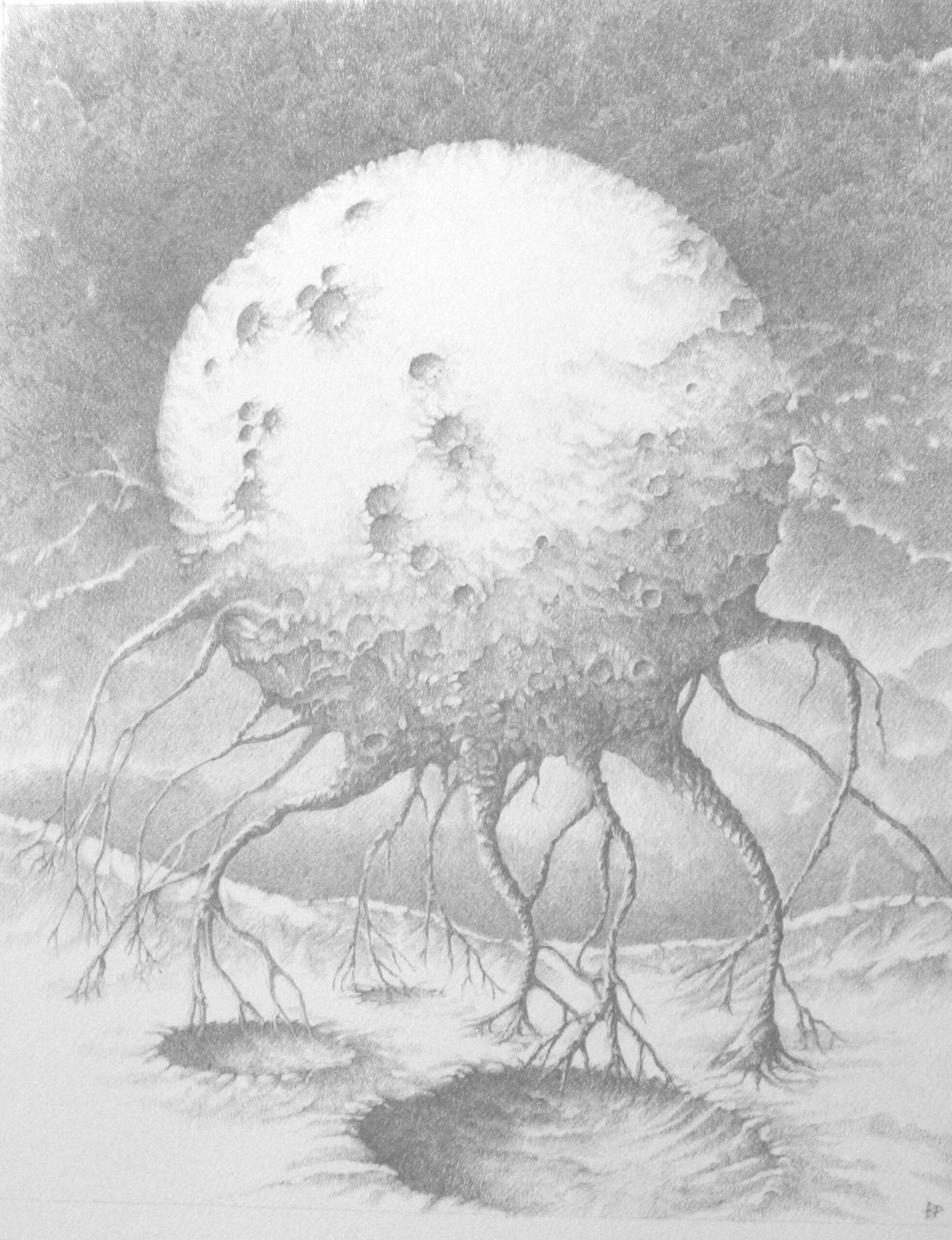 Je pratique le dessin au graphite et à l’ encre dans un travail au trait proche des techniques traditionnelles de gravure. Cela me permet de décrire soigneusement des textures, des ombres, des modelés et de proposer un univers fantastique et onirique dans lequel tout peut arriver: des rochers peuvent flotter, des planètes se rapprocher, des hybridations apparaître et des passages s’ ouvrir entre différents univers. C’ est une recherche de poésie visuelle et hors du temps, devant laquelle la personne qui regarde peut se raconter ses propres histoires.