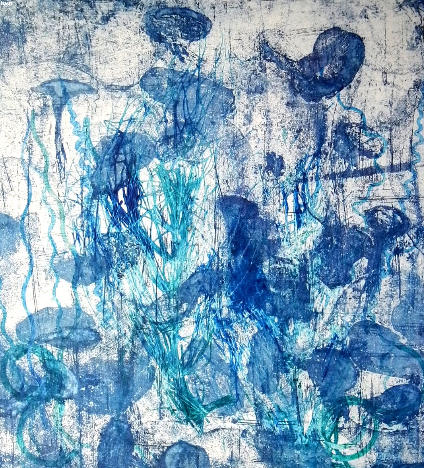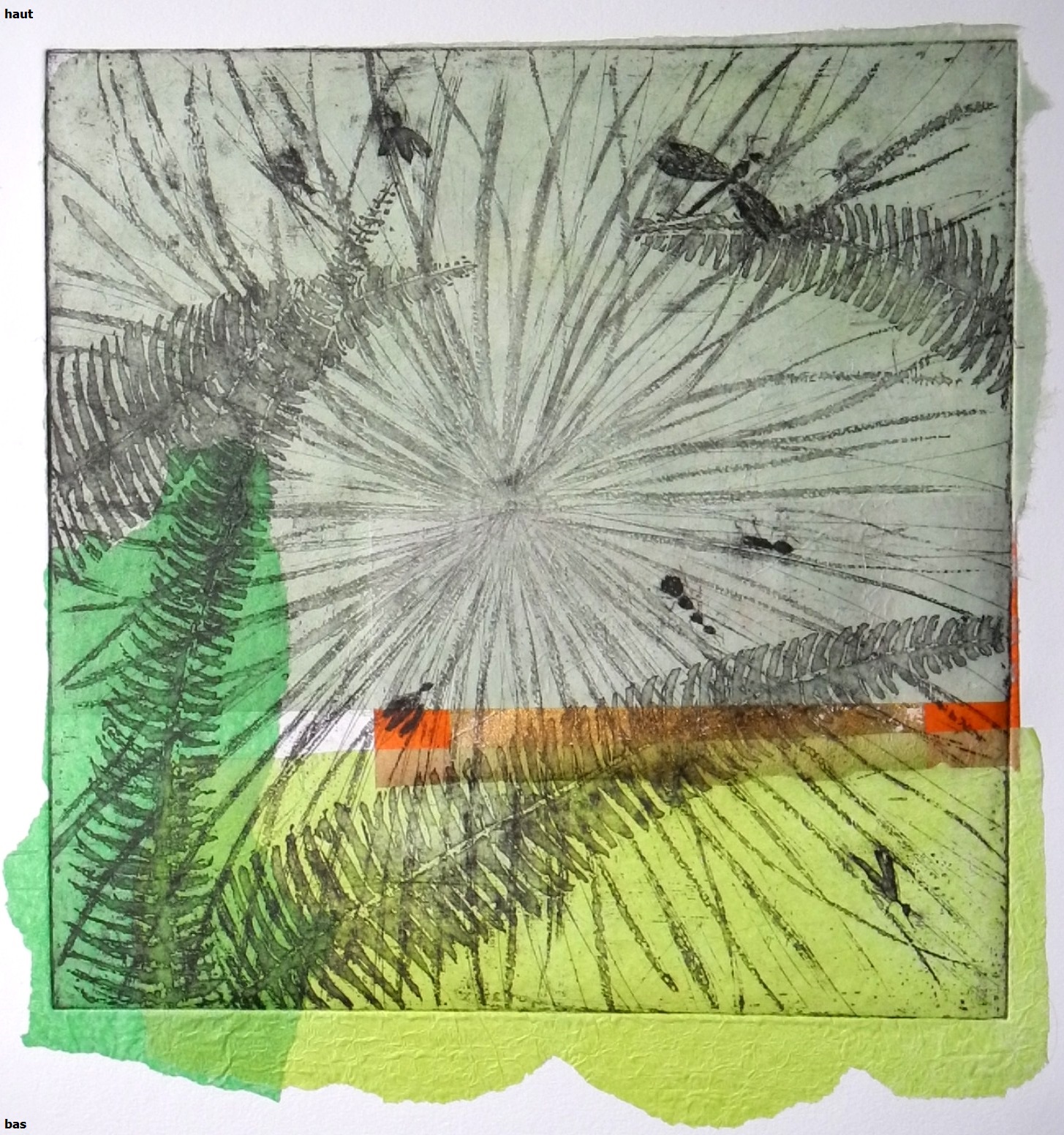 Le travail de la matière est très présent grâce aux techniques propres à la gravure, il y a aussi des rajouts d’empreintes en couleur réalisés lors d’un second passage sous presse.