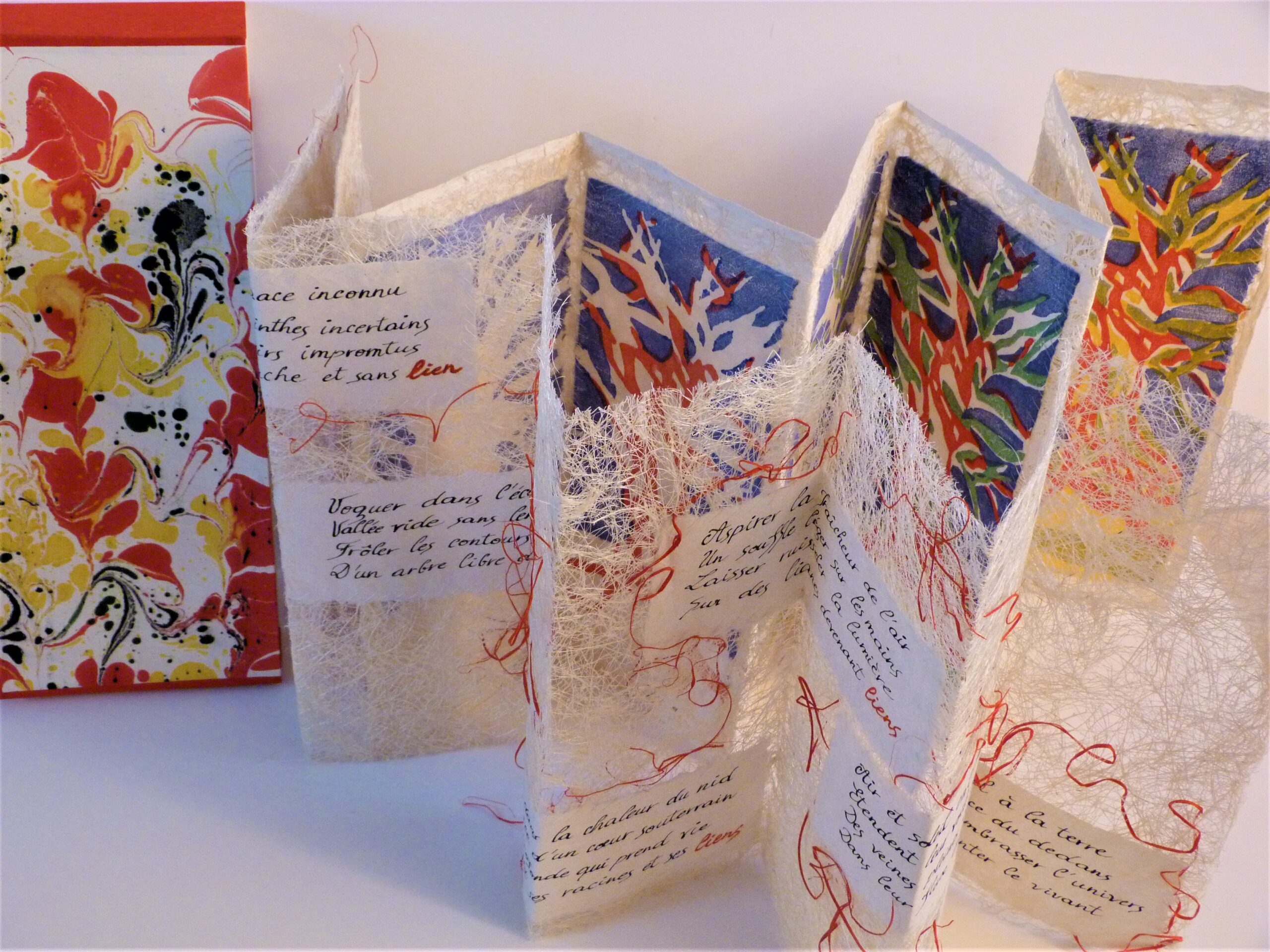 Ils résonnent avec les mots, textes poétiques, dans mes livres-objets, formats intimes, qui se transforment pour se déployer et être partagés, exposés.