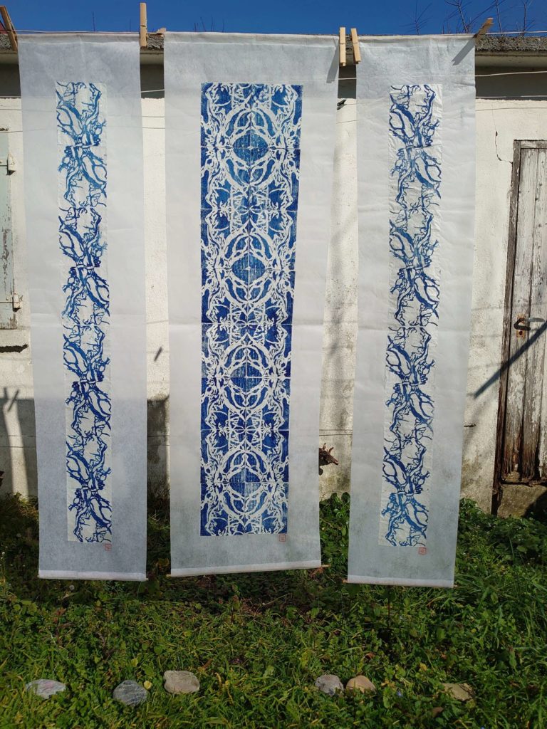 La technique de l'estampe japonaise, bois gravé, m'a permis le contact direct avec cette matière, et s' accordant avec ses contraintes, la patience et l' humilité. Se relier également à un savoir-faire ancestral par-delà les continents, les siècles, n'en a que plus de valeur dans mon attachement pour cette technique.