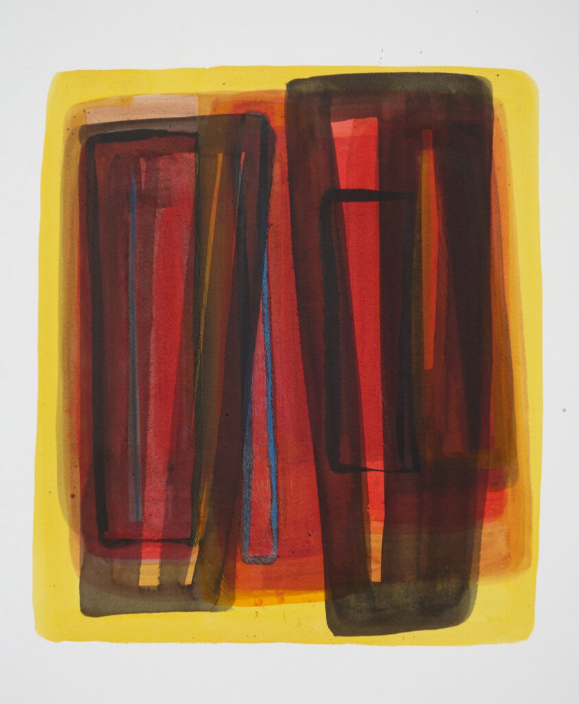 C’est la peinture qui me guide ; à chaque œuvre s’invente une nouvelle forme, une histoire différente, un geste en appelle un autre, une couleur se lie à une autre. D’une apparente simplicité, les formes apparaissent dans un jeu de transparences et d’opacités réalisées lors des passages intuitifs de la brosse, et se crée alors un environnement qui s’impose avec vigueur et fermeté.