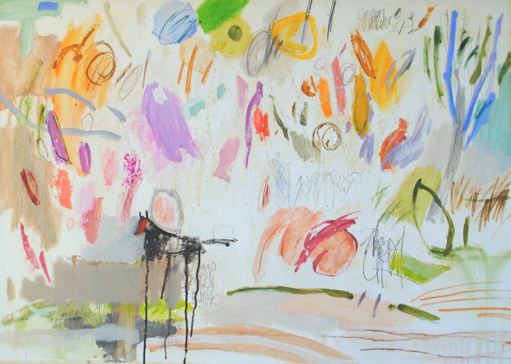 Je m’intéresse depuis plusieurs années à la notion d’ «abstraction narrative », une façon subjective d’aborder le réel par la couleur et la forme. Inspiré par l’énergie de l’expressionnisme abstrait, que je tente de pousser vers un récit ouvert à l’expérience de l’observateur… La figuration n’est jamais très loin. Chacun pourra trouver, dans l’harmonie des couleurs et l’énergie des graphismes, matière à histoire…